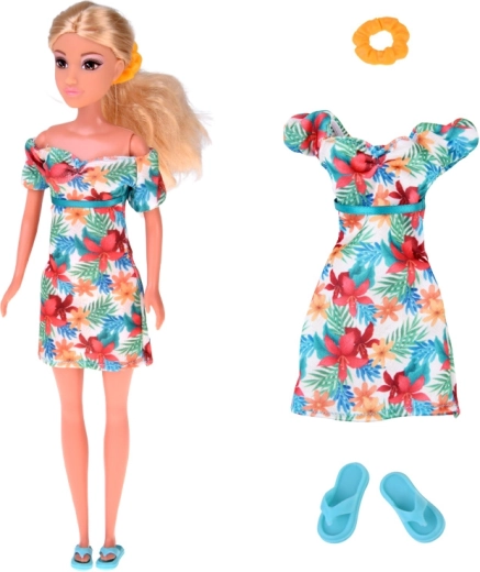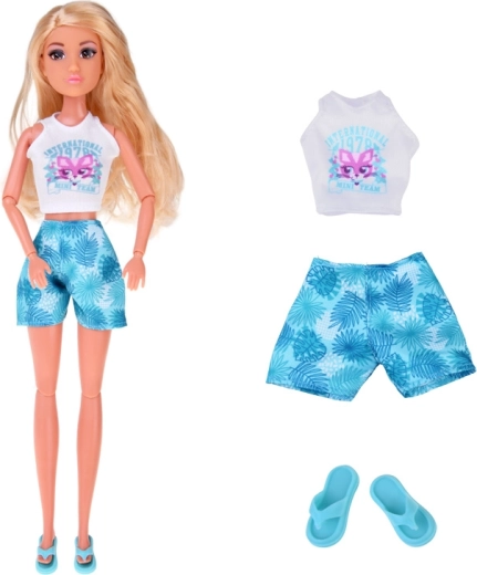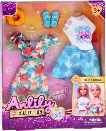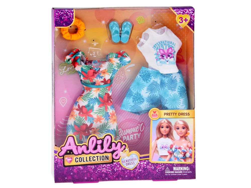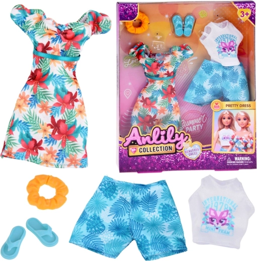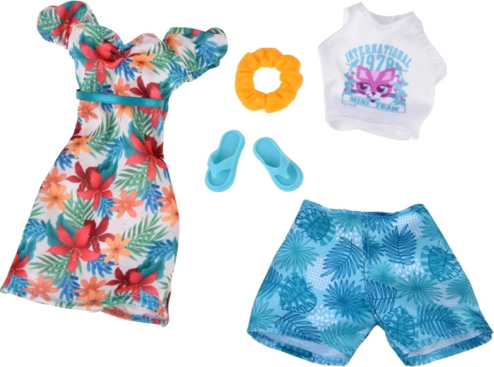 Komplet ponuja dve poletni stilizaciji: lahkotno obleko z havajskimi cvetovi, idealno za sprehode po plaži, in belo crop majico s kratkimi hlačami z motivom listov za udobne dneve, polne dogodivščin. Popolno za ustvarjalno igro, preoblačenje in pripovedovanje počitniških zgodb.
