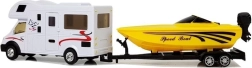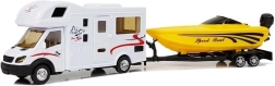 Ta stilski karavan z rumenim motornim čolnom je idealen za male voznike in ljubitelje vode. Zahvaljujoč pognu na vztrajnik je dovolj vozilo nežno potegniti nazaj in spustiti – samo se požene naprej. Realistične podrobnosti, kot so sedeži in volan, spodbujajo domišljijo in razvijajo pripovedovanje zgodb.