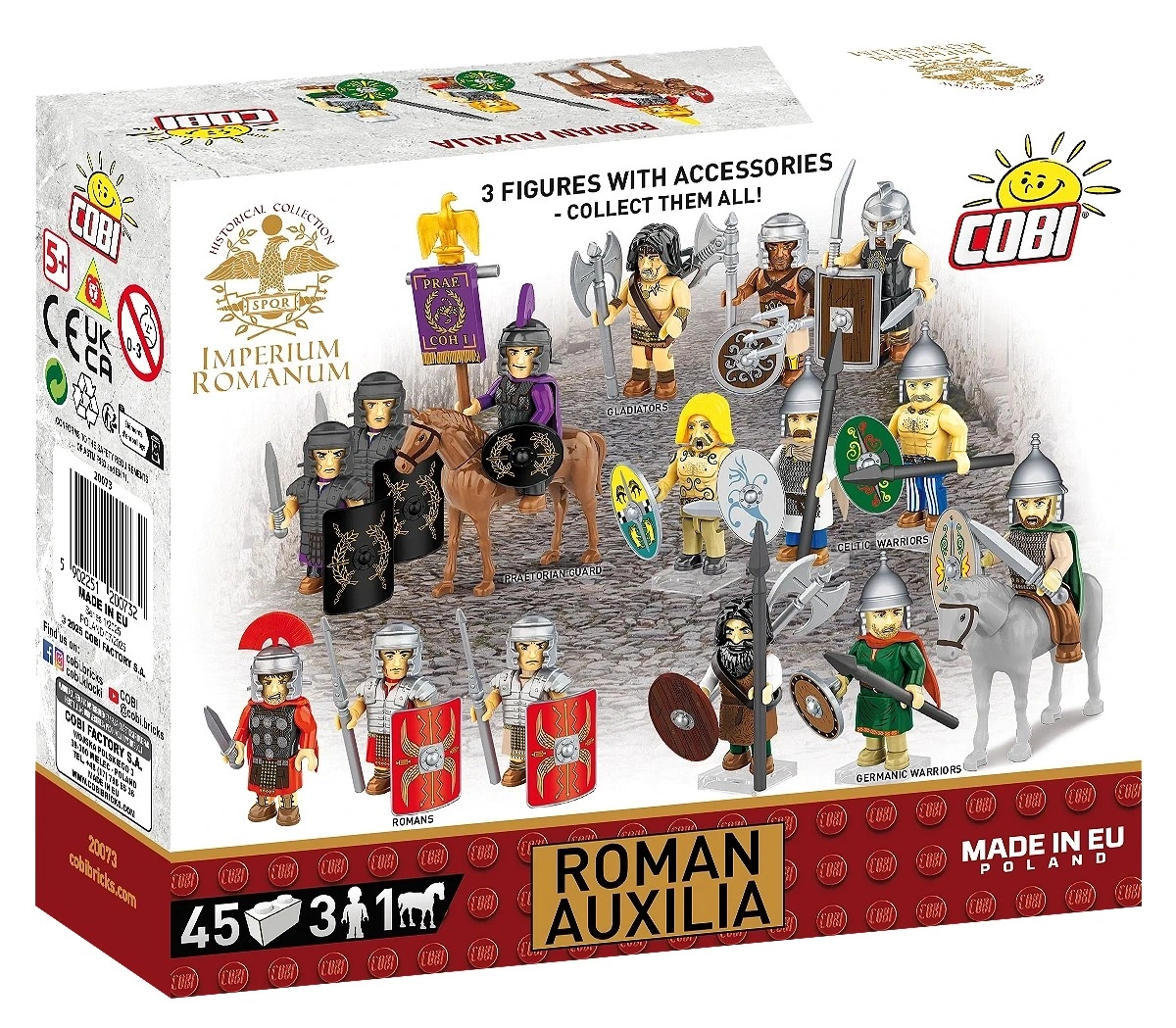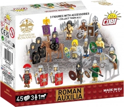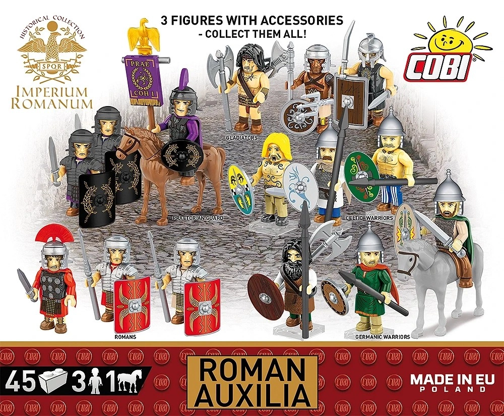 Razširite svoje imperij z elitnimi pomožnimi enotami ROMAN AUXILIA. Komplet ponuja tri povsem gibljive figurice z zgodovinsko navdihnjenimi detajli, nove ovalne ščite s potiski, realistične čelade, sulice in meč gladius. Ne manjka konj s sedlom za konjeniške manevre in impresivne diorame.