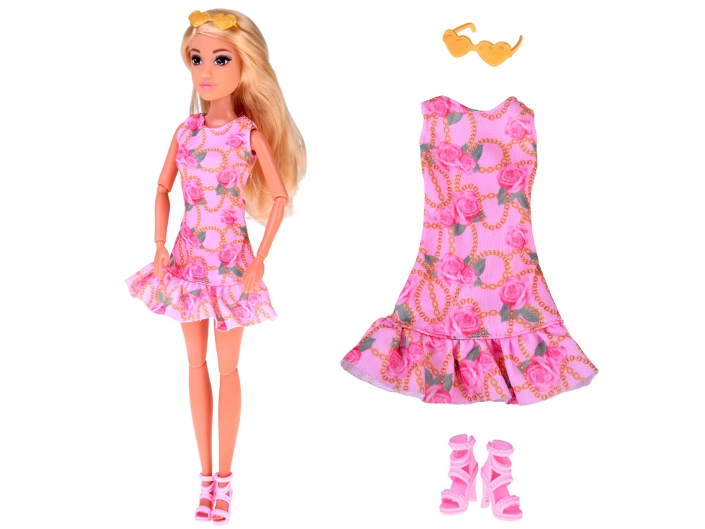 Vsebina paketa vključuje romantične rožnate obleke s cvetličnim in verižnim vzorcem ter udoben turkizen top s cvetličnimi širokimi hlačami. Stil dopolnijo rožnati čevlji s peto, rumena očala v obliki srca, majhna torbica in drugi drobni dodatki. Odlično za mešanje in kombiniranje outfitov ter igro modne stilistke.