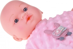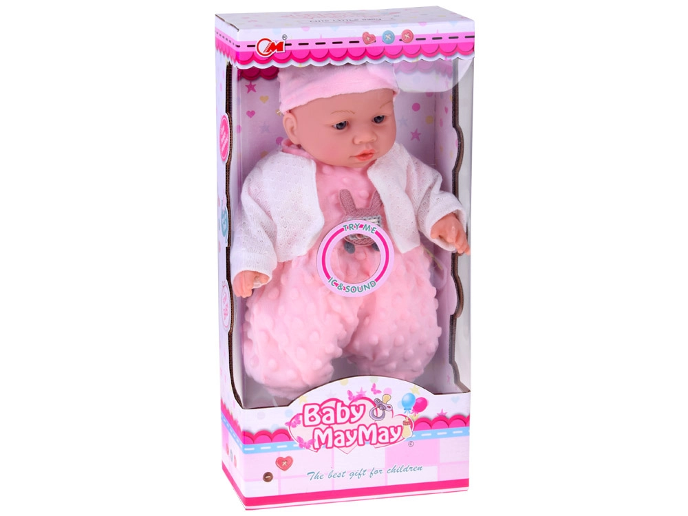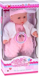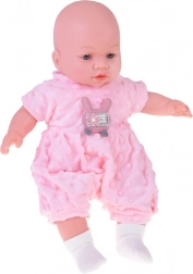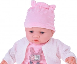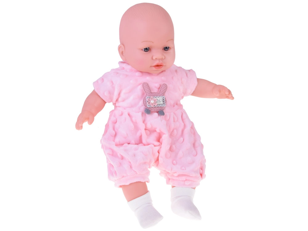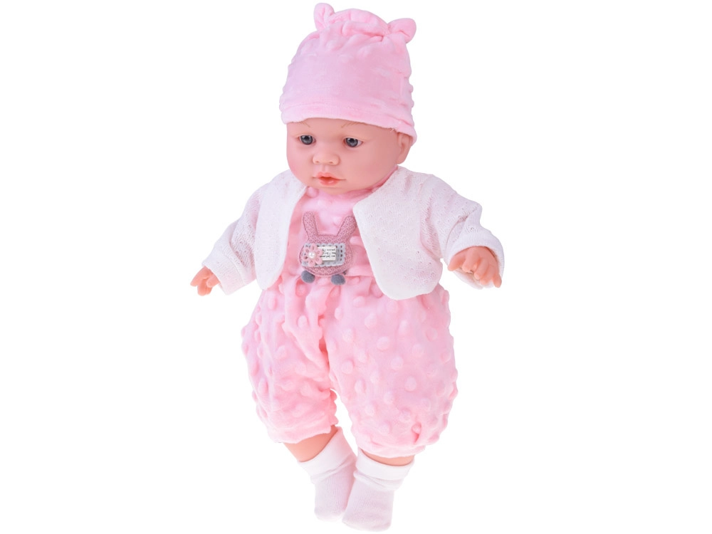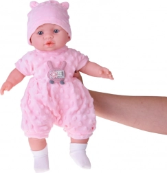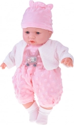 Ljubka dojenčkova punčka višine 40 cm razveseli vsakega otroka od 12 mesecev dalje. Zaradi mehkega tekstilnega trupka je odlična za crkljanje, je lahka za nošenje in ima realistične podrobnosti obraza. Ob pritisku na trebušček oddaja različne zvoke – blebeta, smeje se, pojamra in godrnja. Priloženi so mehak rožnat minky pajacek z aplikacijo, kapica z ušeski, bel kardigan in nogavičke.
