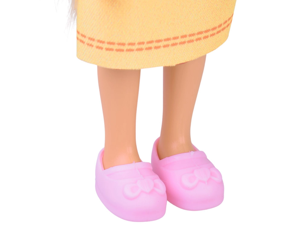 Punčka je lahka, trpežna in zasnovana za preprosto držanje v otroških rokah. Detajli obraza, rožnati čeveljčki s pentljico in možnost poziranja jo naredijo odlično darilo za vsakodnevno igro doma ali na poti.