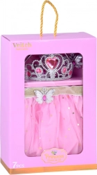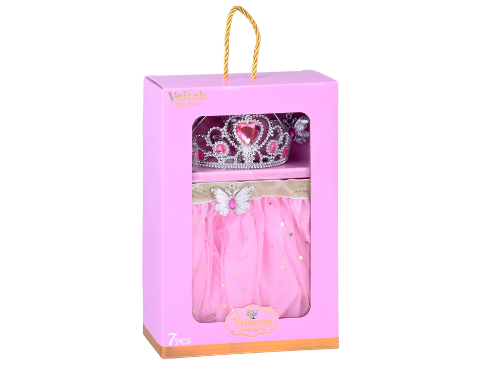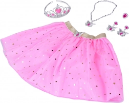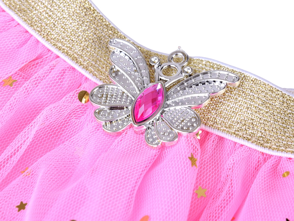 Ustvarite doma čarobni svet poln isker in domišljije. Rožnato tilasto krilo z zvezdicami in lunicami se lepo ziblje pri vsakem koraku, lahkotna plastična krona in usklajeni dodatki pa malim princeskam podarijo samozavest in sijoč nasmeh. Komplet je usklajen v motivu metulja – simbola lahkotnosti in svobode.