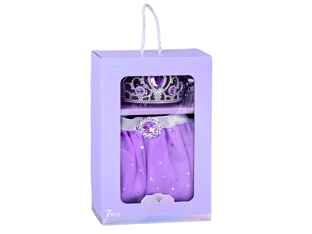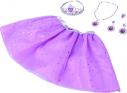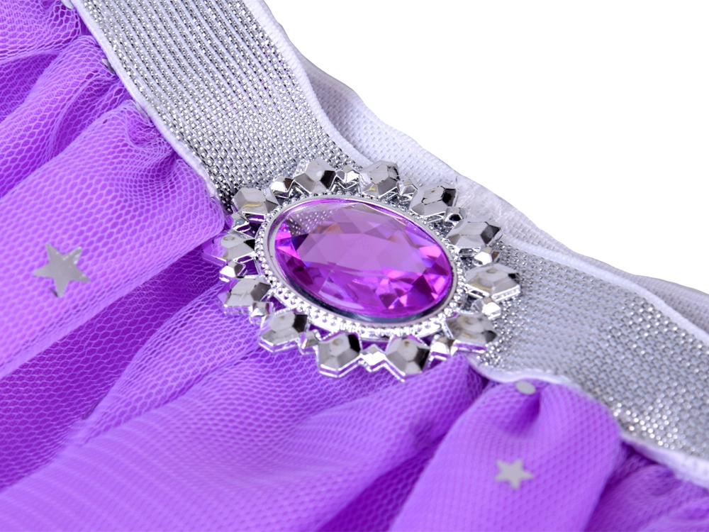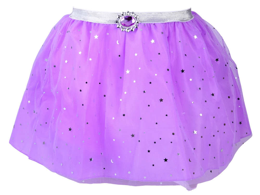 Spremenite vsako preoblačenje v pravljični ples. Vijolično tutu krilo s sijočimi zvezdami in lunicami očara na prvi pogled, medtem ko srebrna krona, ogrlica, prstan in viseči uhani z vijoličnimi kamenčki dopolnijo kraljevski videz. Elastičen pas zagotavlja udobje in enostavno oblačenje.