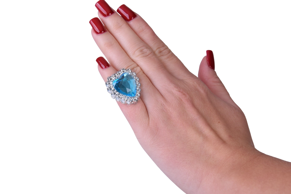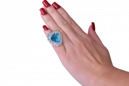 Klips uhani in izrazit prstan s srčastimi modrimi kamni lepo dopolnijo celoten set in se zlahka nataknejo ter snamejo.