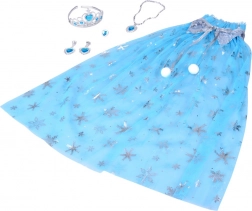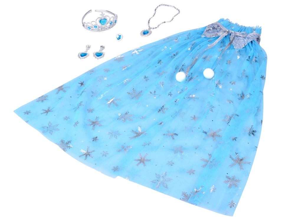 V kompletu je tudi celoten set nakita: plastična krona z modrimi “dragulji”, ogrlica s kapljičastim obeskom, izrazit prstan in klips uhani s srčastimi kamni. Vse je lahko, udobno in prilagojeno za otroško preoblačenje.