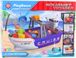 Ta velik in stabilen otroški čoln za kopel ali igralnico prinaša zares realistične vodne igre. Zaprt krogotok vode z električno črpalko varčuje z vodo in omogoča neprekinjeno točenje v lončke ter pomivanje »posodic«. Otroci se preizkusijo v vlogi malih ribičev zahvaljujoč premičnemu žerjavu, vlovljenju ribic na palico in rokovanju z dodatki.