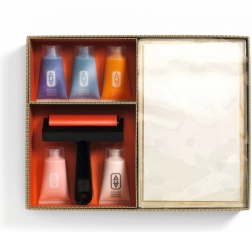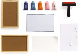 Vse, kar potrebujete za prvi tisk: gelna plošča, brayer, barve, papirji in šablone. Odprite škatlo in ustvarjajte – brez dodatnih pripomočkov.