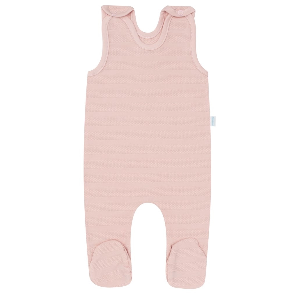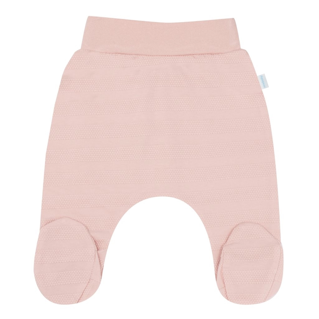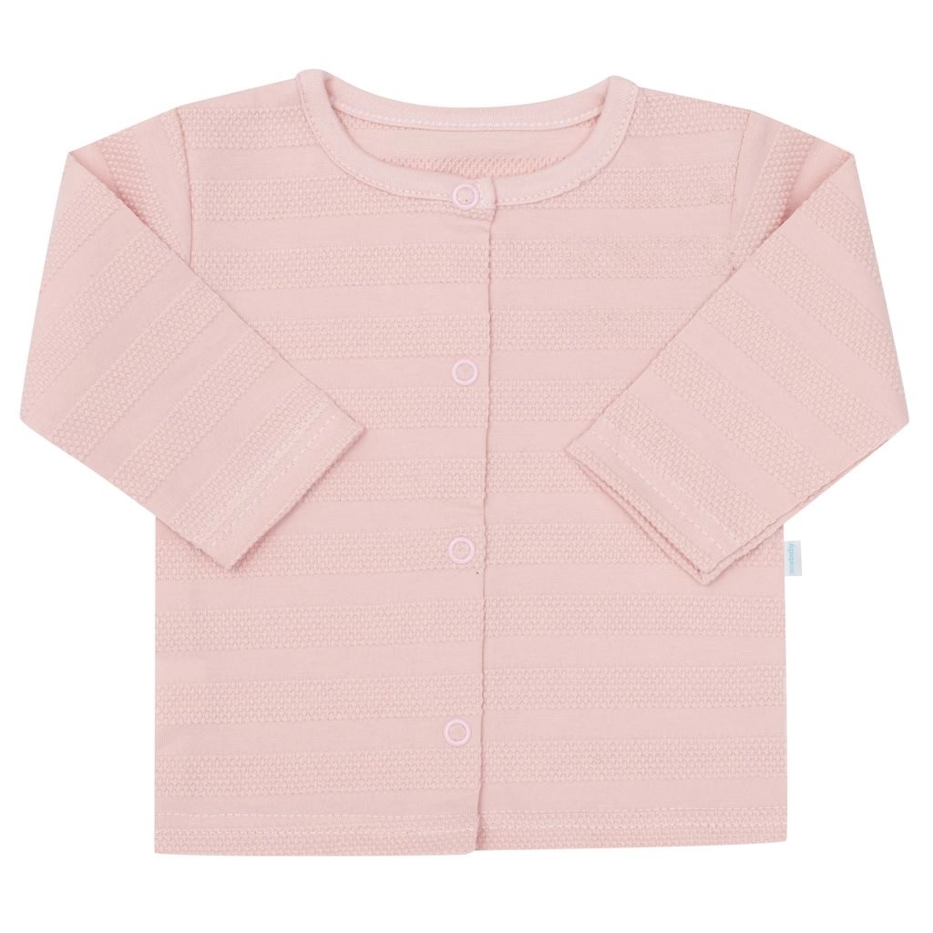 V kompletu najdete: popolnoma razpirajoč bodi z dolgimi rokavi (stransko zapiranje in pritiskači med nožicami), pajacke (pritiskači na naramnicah in v razkoraku), jopico s pritiskači po celotni dolžini ter mehko kapico s širokim robom. Modernen, nežen dizajn in usklajena rožnata barva bosta razveselila vsakega starša.
