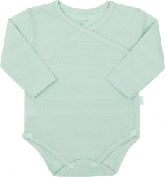 Komplet v nežnem mentol odtenku z diskretno teksturo deluje čisto in moderno. Odličen je za porodnišnico, domače nošenje in kot prisrčno darilo. Dobavljen je v EKO embalaži, pripravljeni za podarjanje.