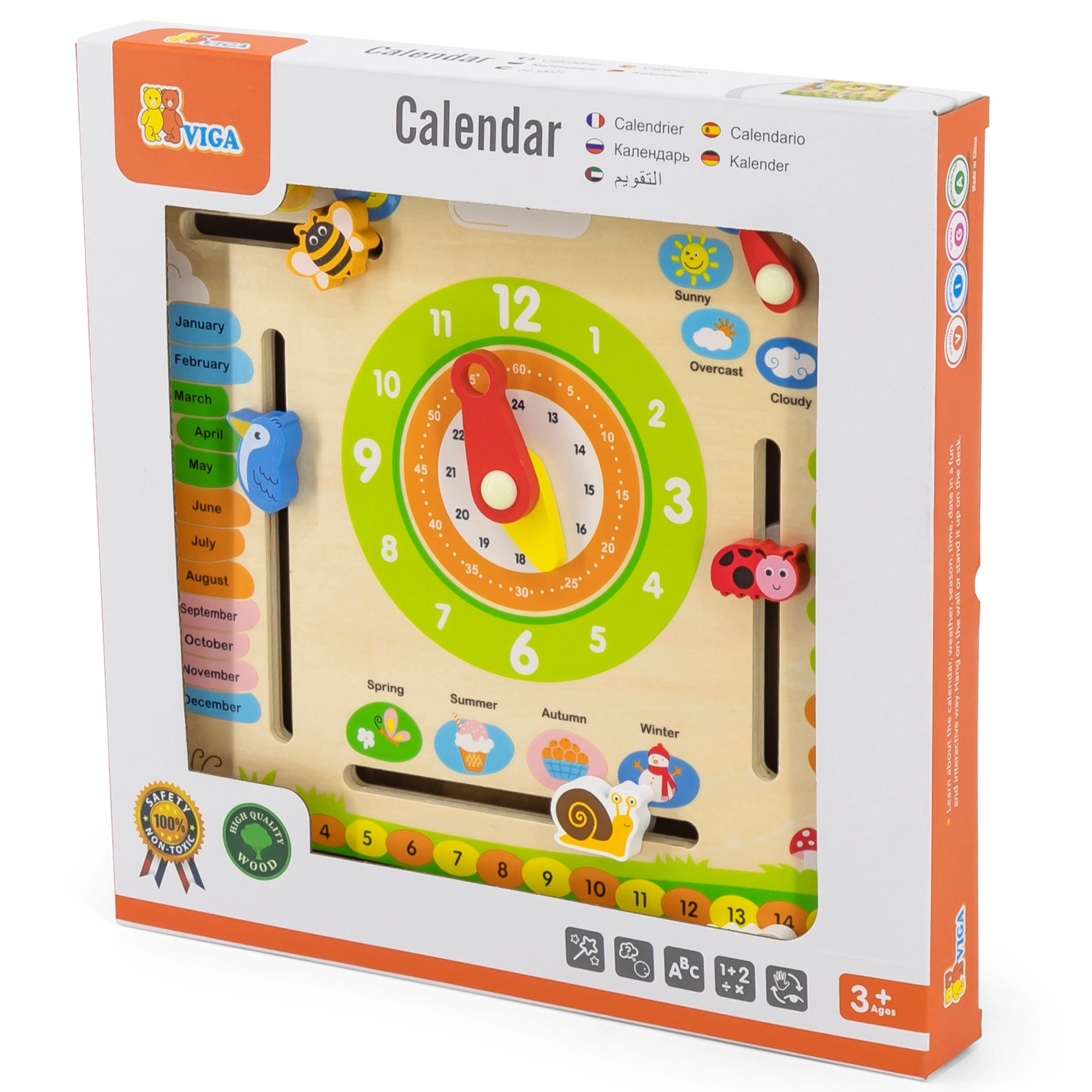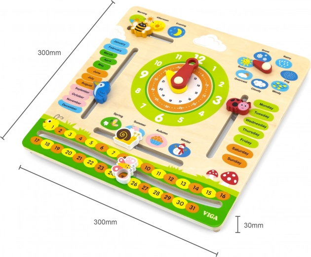 Izobraževalni koledar VIGA je idealen pripomoček za otroke za učenje o času, spremembah vremena in letnih časih. Z barvitimi in gibljivimi elementi pomaga vsakodnevno razumeti koncept časa.