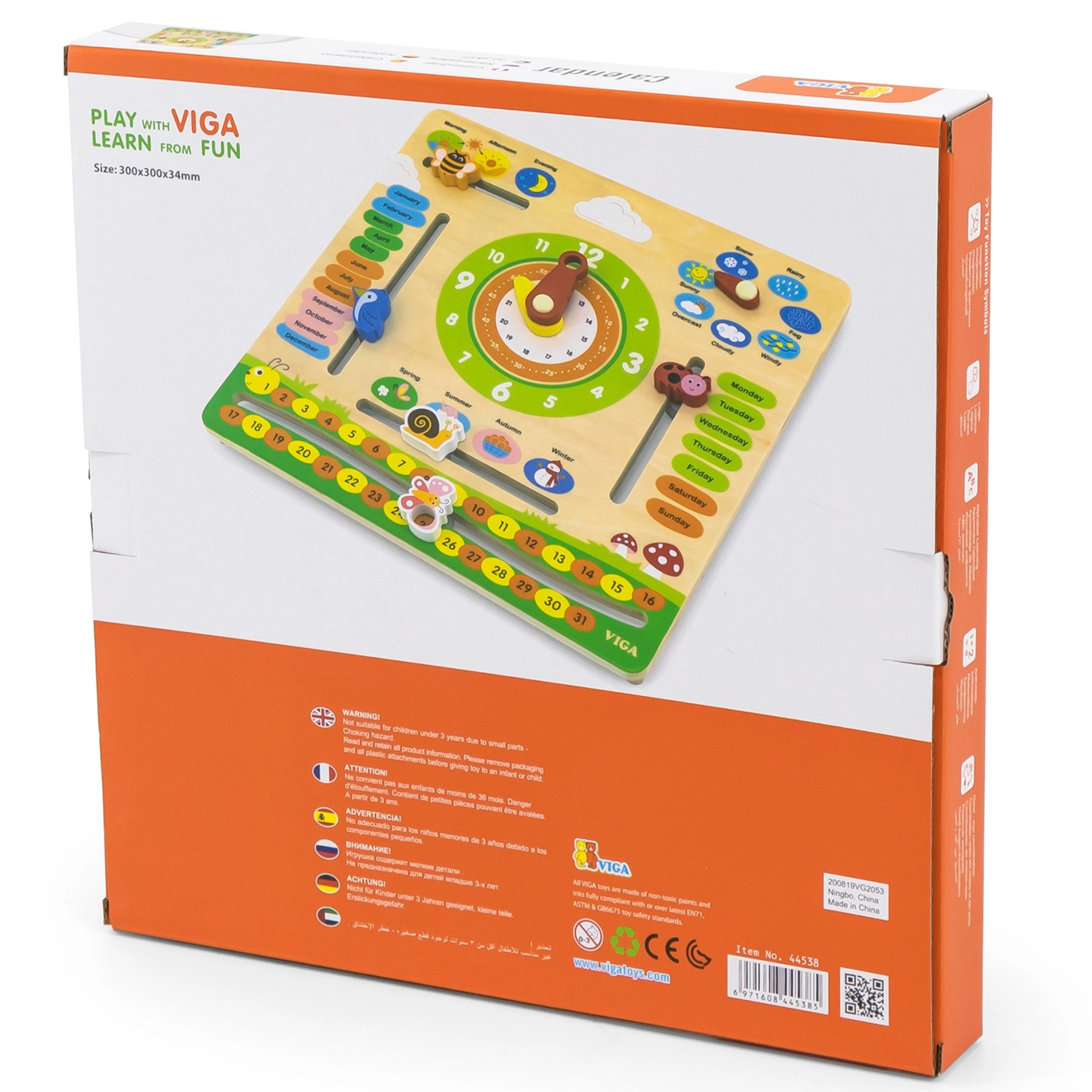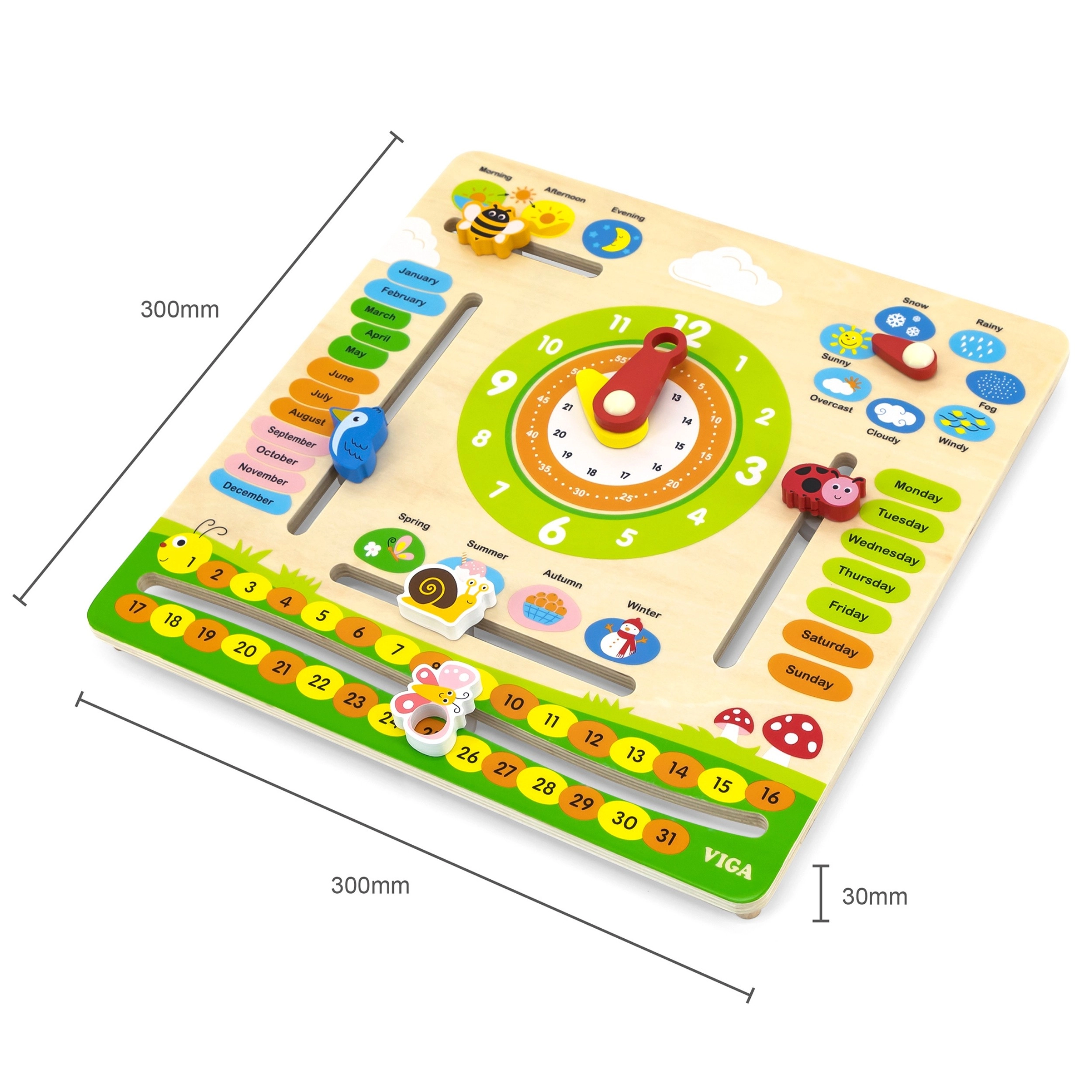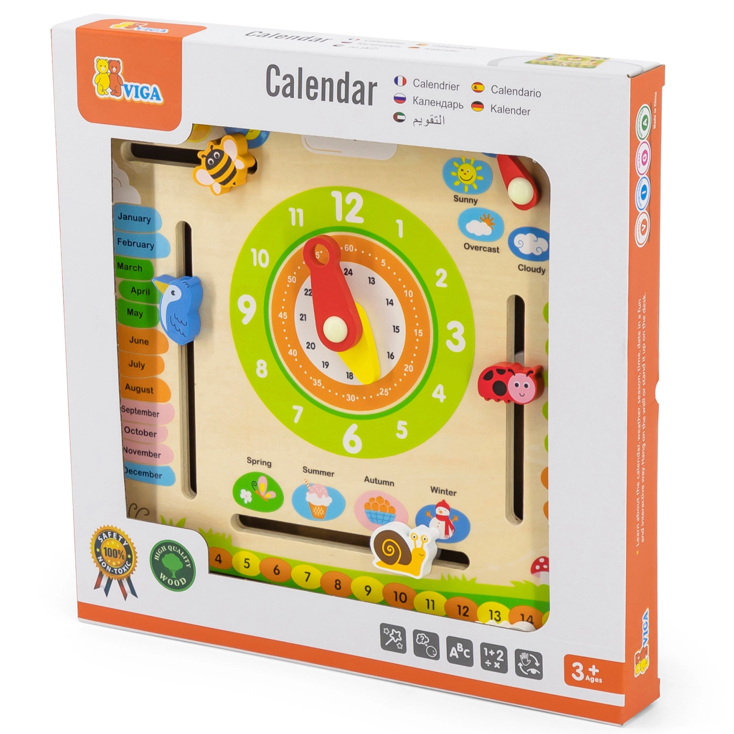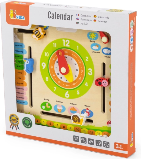 Ta interaktivni leseni koledar blagovne znamke VIGA je zasnovan tako, da otrokom pomaga širiti znanje o datumu, času, vremenu in letnih časih. Lahko ga obesite na steno ali postavite na mizo, kar ga naredi ne samo funkcionalen, ampak tudi dekorativen element v otroški sobi. Z privlačnimi barvami in prikupnimi ilustracijami je učenje zabavno.