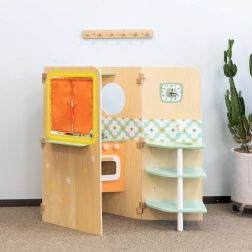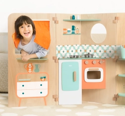 Hišica se preprosto razpre v igralne cone in prav tako hitro zloži v kompaktno obliko, zato je idealna za manjše sobe. Bogat komplet dodatkov (lonci, skodelice, pribor, sol in poper) podpira igro vlog, socialne interakcije in razvoj veščin.