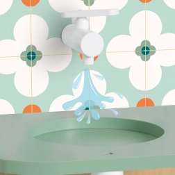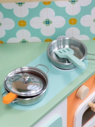 Otroci lahko »kuhajo«, pečejo in strežejo pri okencu. Odpiralna vratca, vrtljivi gumbi in poličke podpirajo realistično igro in organizacijo dodatkov.