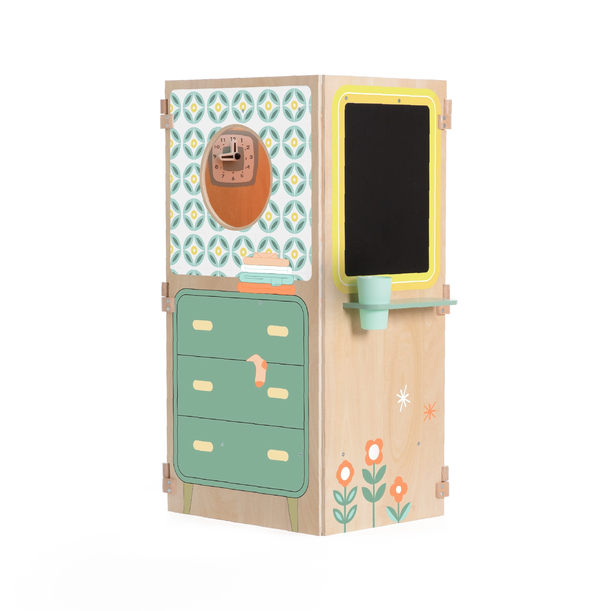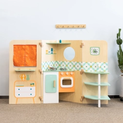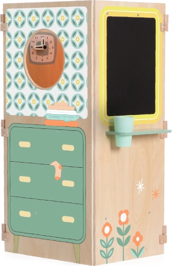 - Večnamenska zabava: kuhinjica, pralnica, okence za mini gledališče in tabla