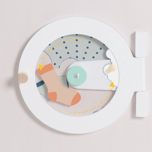 Vgrajen »pralni stroj« z okroglim okencem in kontrolnimi elementi razširja teme igre – od pranja do sortiranja perila in skrbi za gospodinjstvo.
