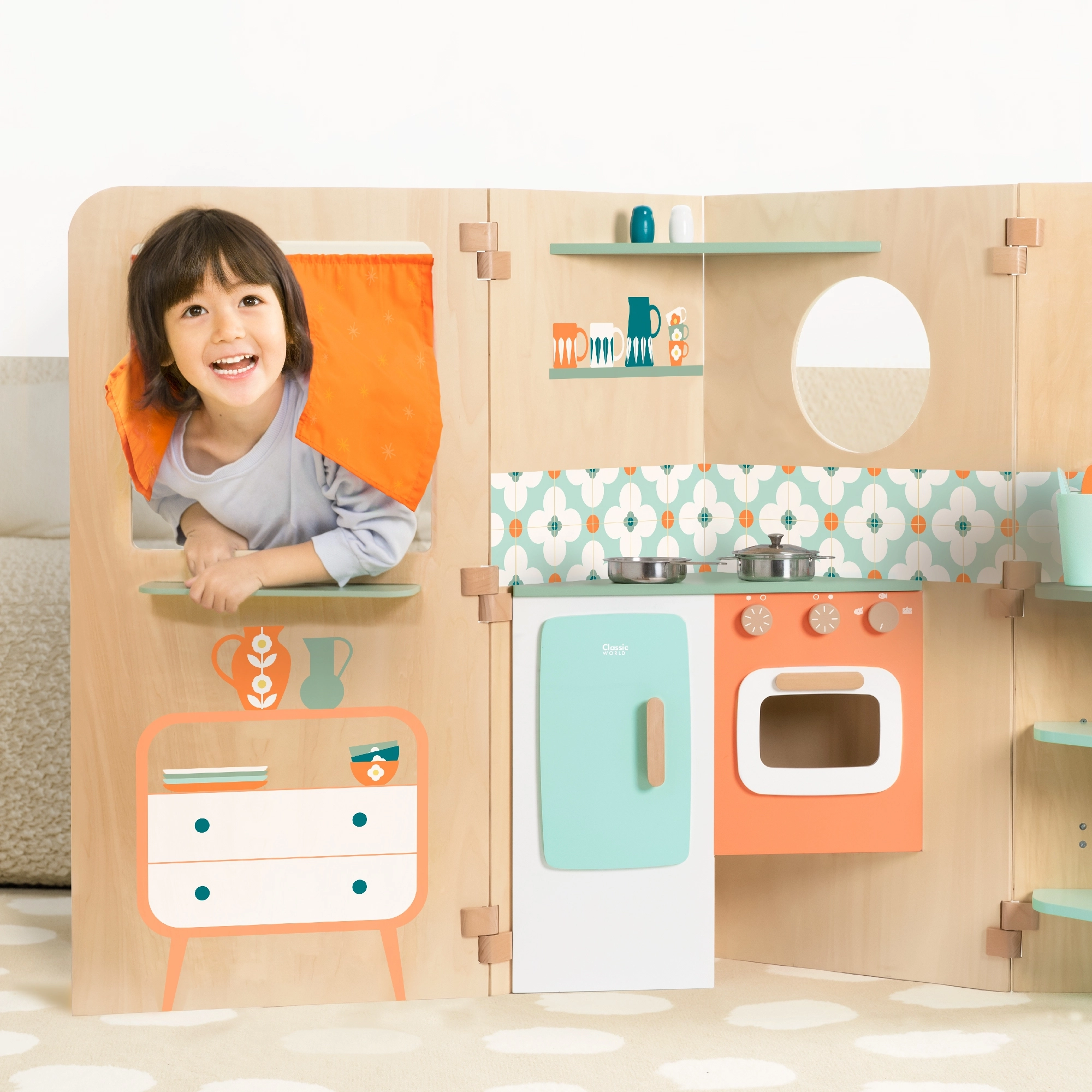 Odkrijte zložljivo večnamensko hišico CLASSIC WORLD, ki združuje kuhinjico, pralnico, tabla in okence za mini gledališče v enem kompaktnem setu. Zahvaljujoč pametnemu od odpiranju in zlaganju ne zavzame veliko prostora, spodbuja kreativno igro, igranje vlog in razvoj motorike otrok od 3 let naprej.