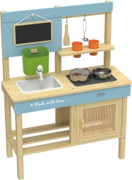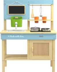 Ta kakovostna otroška kuhinja je izdelana iz naravnega certificiranega lesa in zasnovana brez ostrih robov za varno igro od 3. leta dalje. Zaradi trpežne konstrukcije in pametne razporeditve s kljukicami in policami otroci zlahka pospravijo posodo in pripomočke. Majhna tabla služi kot meni ali seznam nalog – potrebna je le kreda in domišljija se požene na polno.