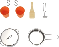 V paketu prejmete: lonce s pokrovkami, 2 kozarčka, lopatico, žlico, obešalne kljukice, tablo za kredo in osnovno kuhinjsko opremo (korito, kuhalne plošče, police). Popolna izbira za zunanje ali notranje kotičke za male kuharje.