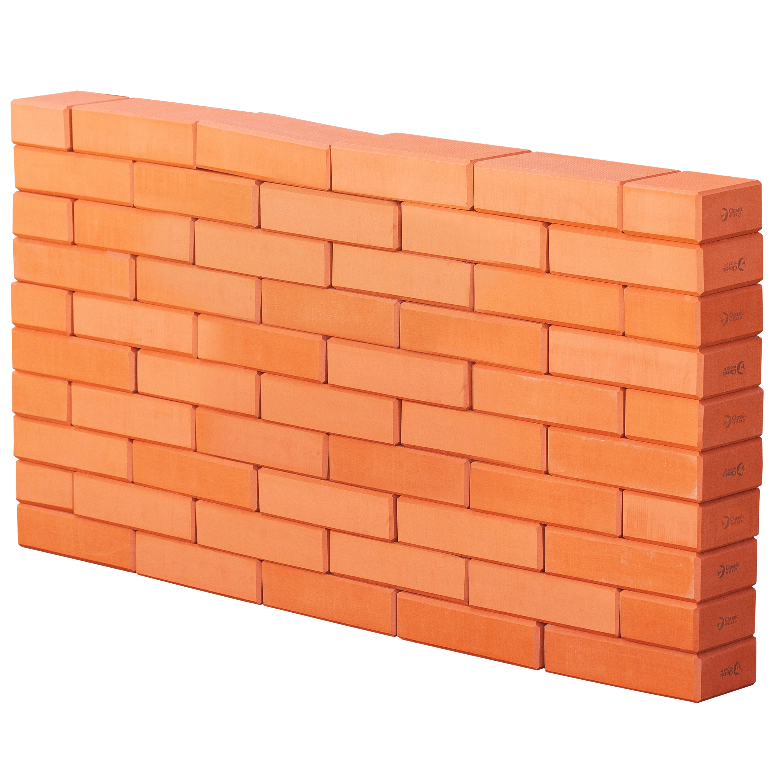 Komplet 90 kosov vsebuje 70 celih opek in 20 polovičnih opek v oranžno‑rdečem odtenku. Zaradi mehkega materiala EVA so bloki lahki, prijetni na dotik in prijazni do otroških rok, hkrati pa dovolj čvrsti za gradnjo zidov, hiš in utrdb. Otroci lahko skupaj načrtujejo in gradijo ter tako razvijajo sodelovanje in komunikacijske veščine.