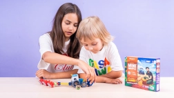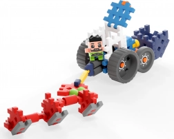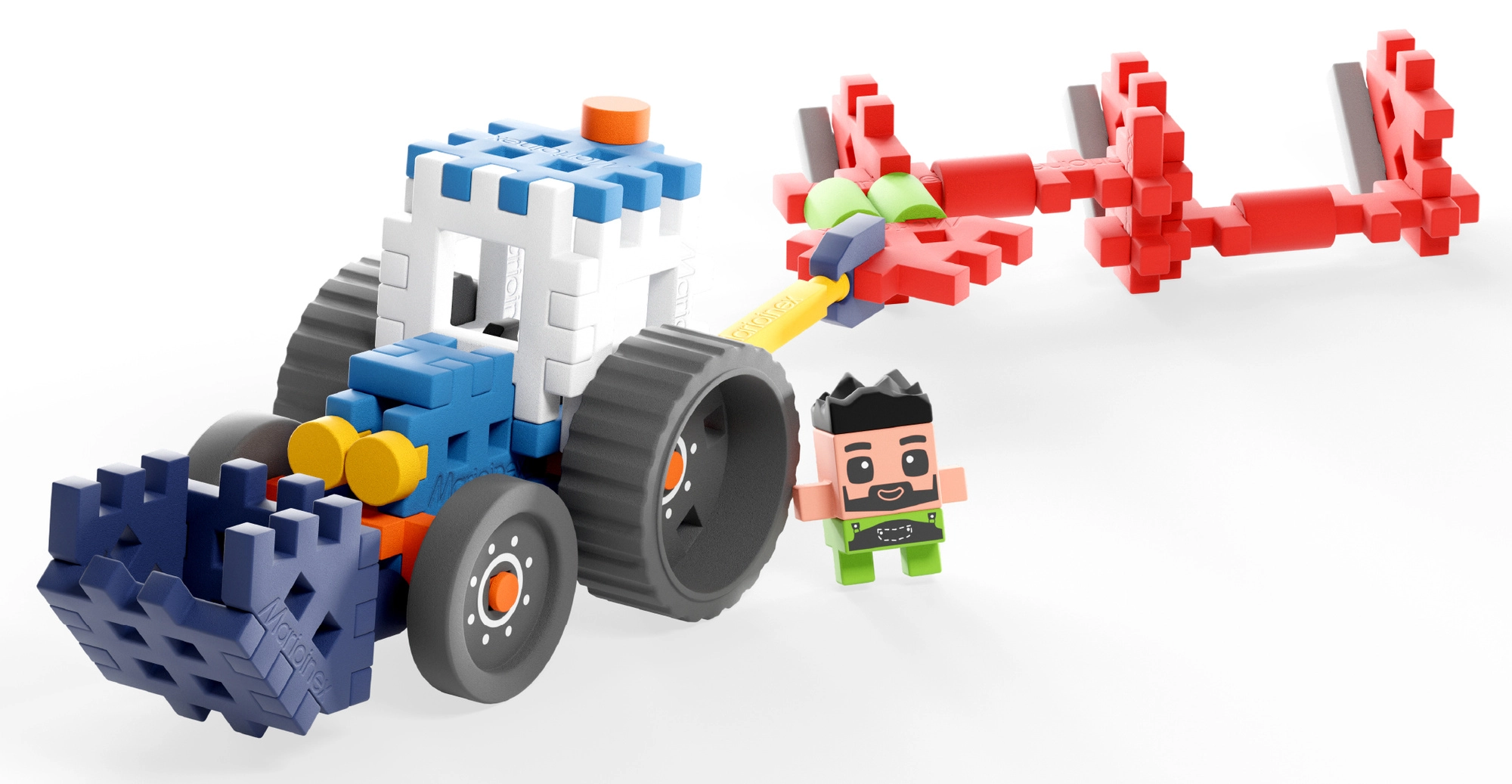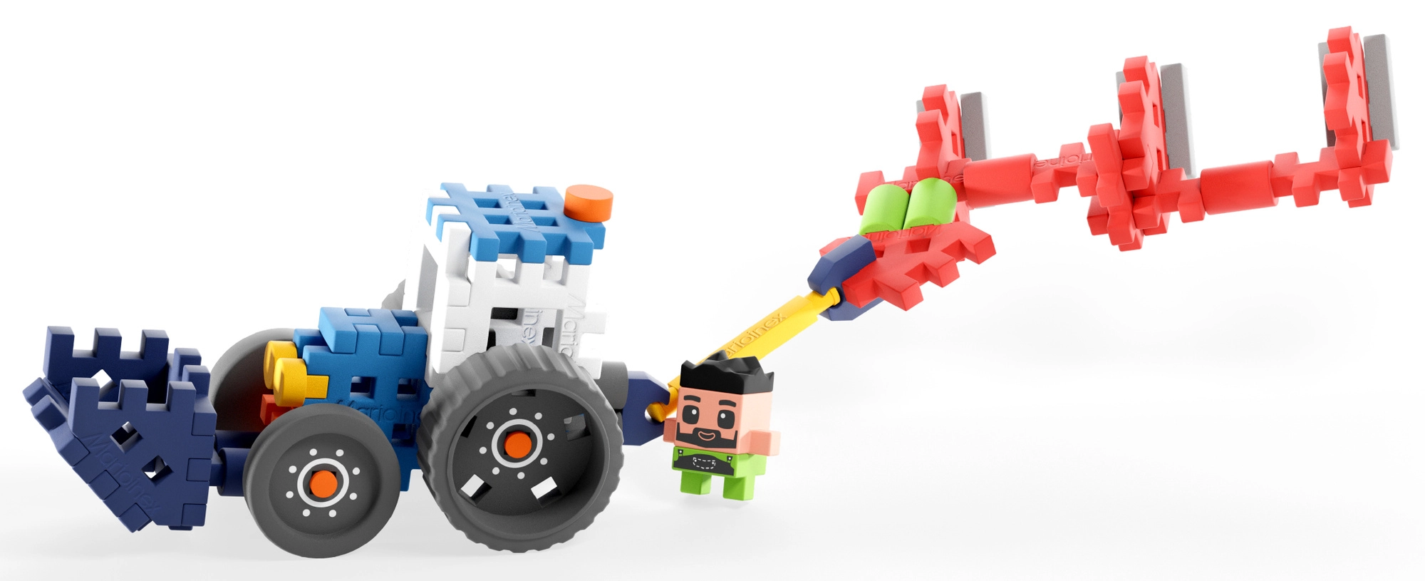 Iz 50 barvitih in prožnih delov enostavno sestavite traktor s sprednjo lopato in zadnjim plugom. Model je idealen za igro in ponovne predelave.