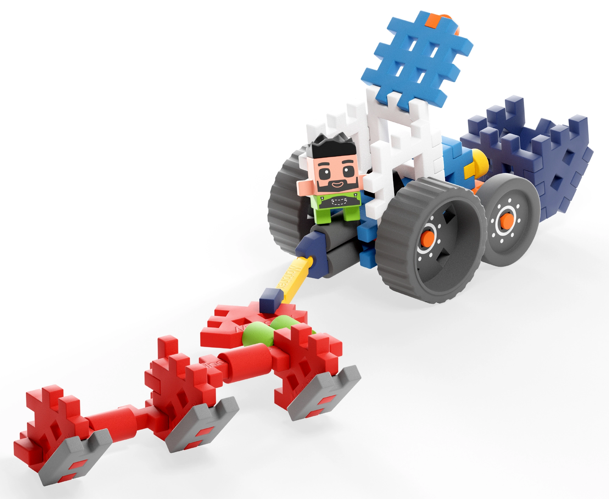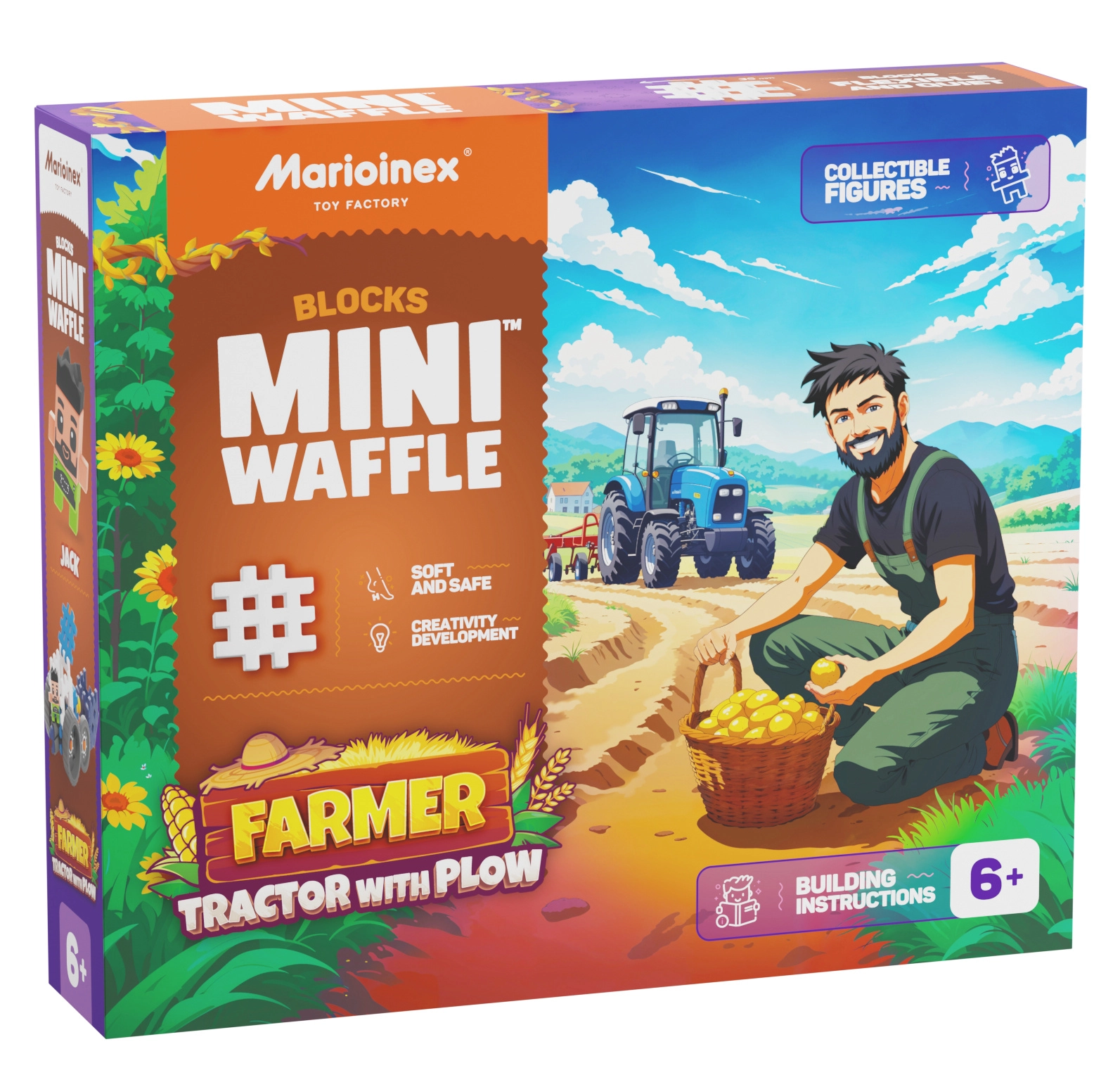 Komplet MINI WAFFLE FARMER – Traktor z plugom otroke popelje v svet vsakdanjega dela na polju. Sestavite realističen model traktorja s funkcionalnim plugom, vključite domišljijo in ustvarjajte lastne zgodbe iz kmečkega življenja. Zaradi prožnih delov je gradnja intuitivna in prijetna, končni model pa je pripravljen za igro.