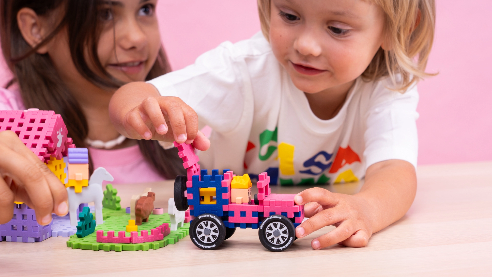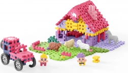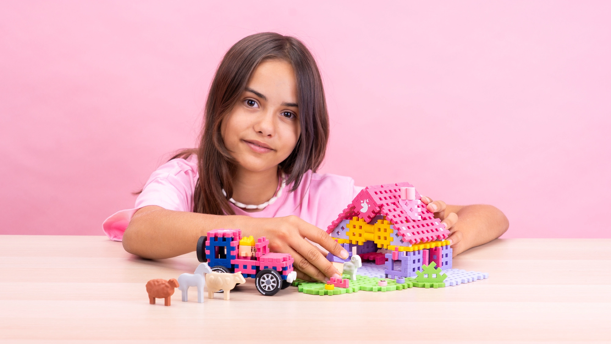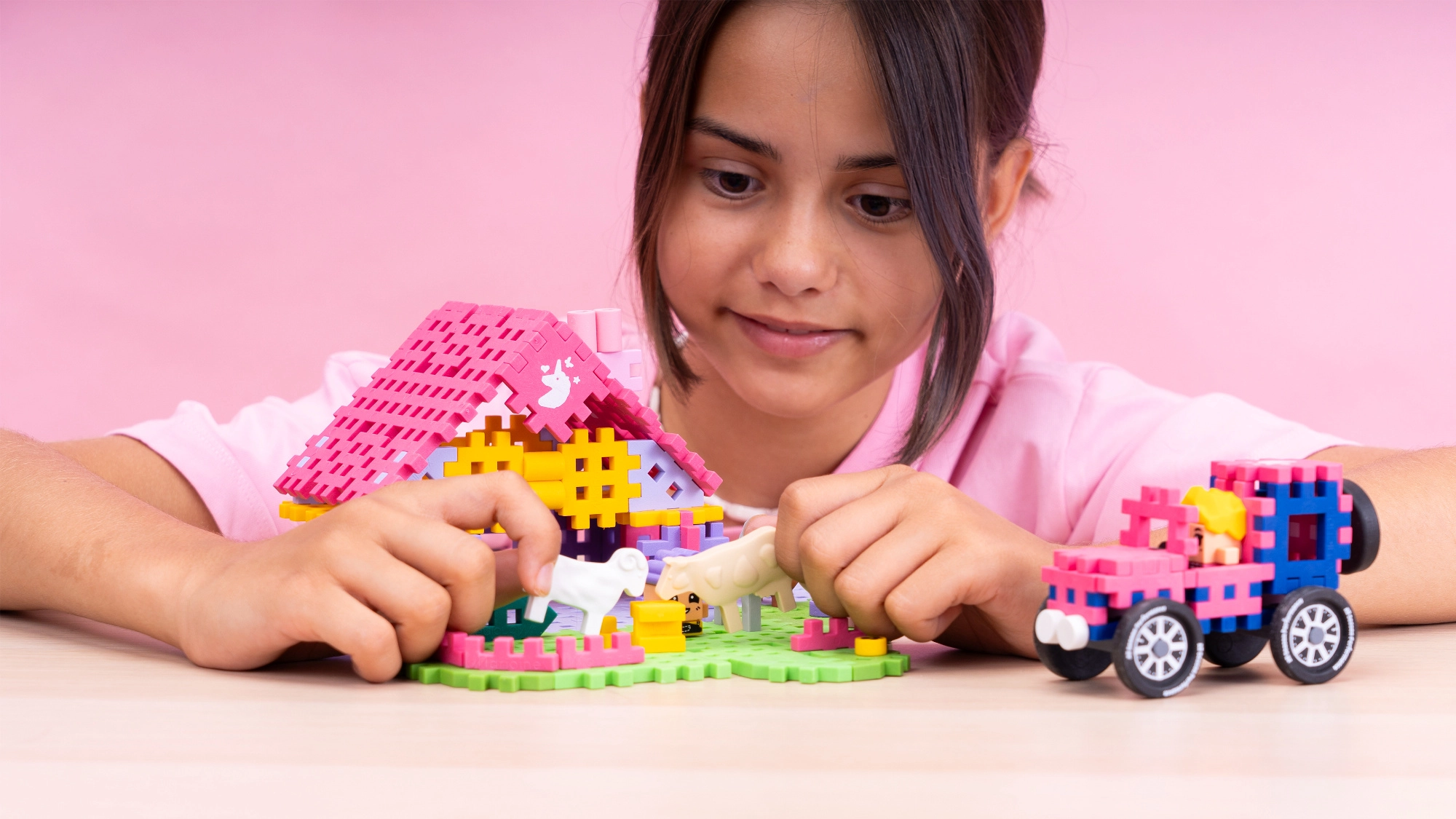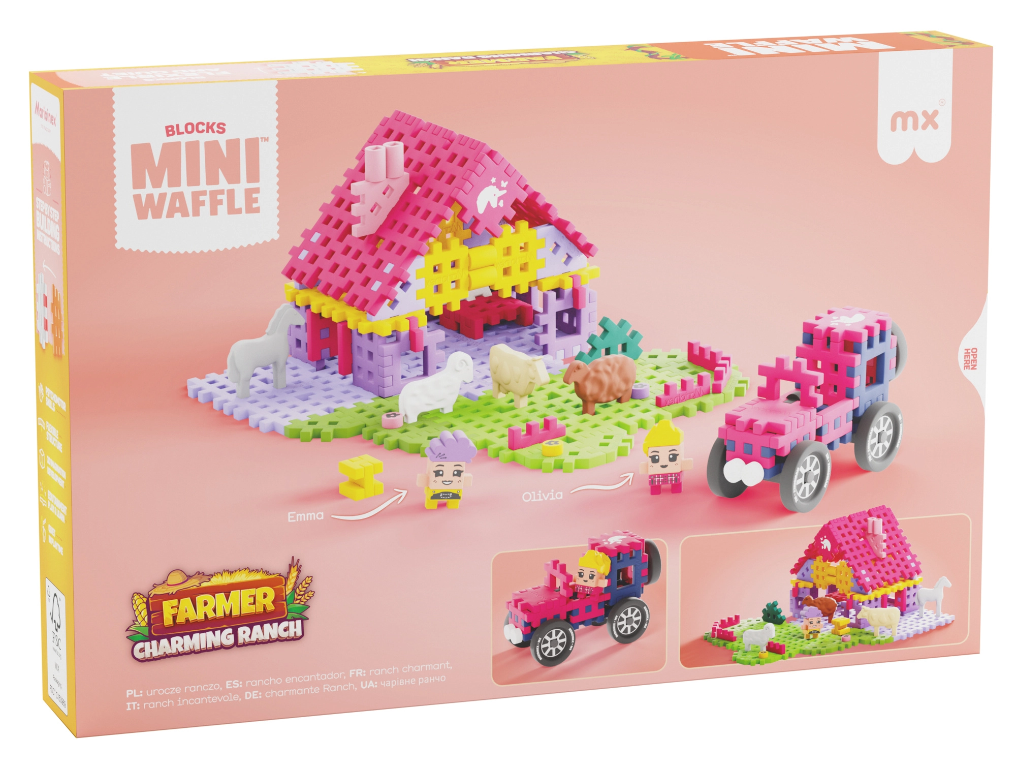 Hiška, ograje, živalice in podrobnosti pokrajine – vse iz barvnih koščkov Mini Waffle, ki spodbujajo domišljijsko igro in razvoj ustvarjalnosti.