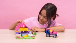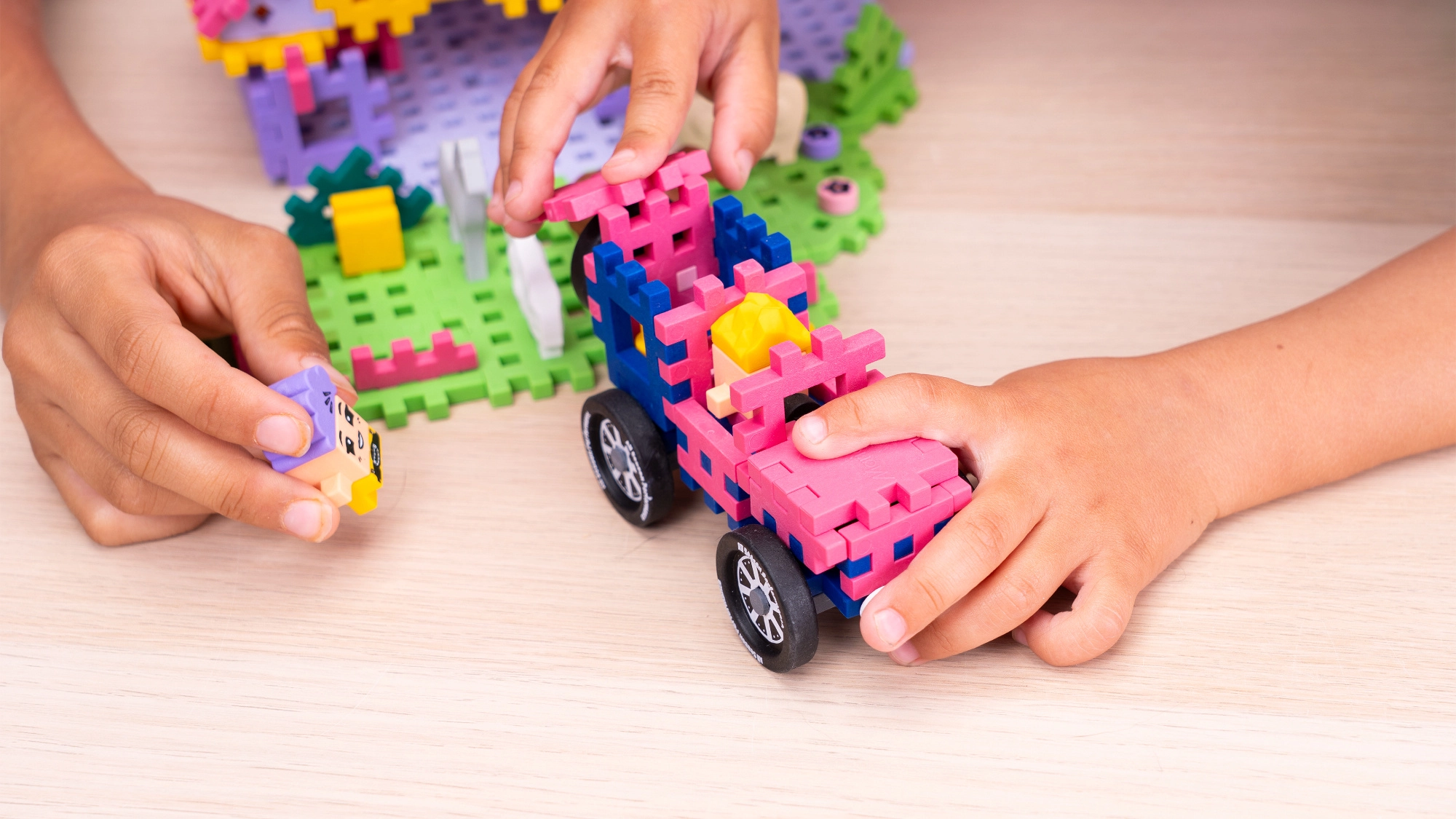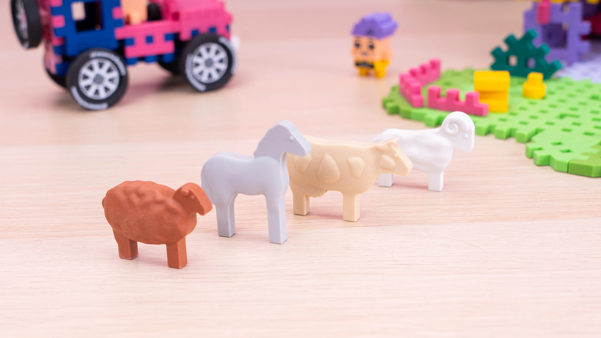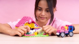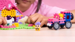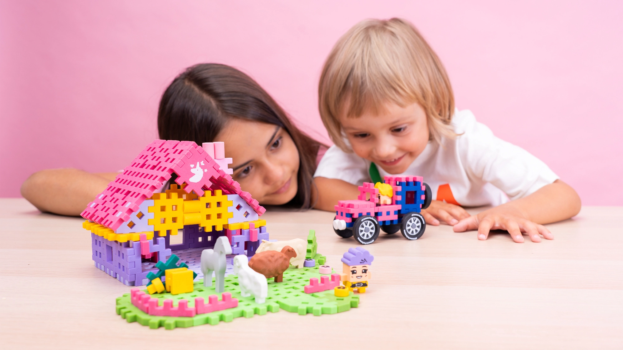 Hiška, ograje, živalice in podrobnosti pokrajine – vse iz barvnih koščkov Mini Waffle, ki spodbujajo domišljijsko igro in razvoj ustvarjalnosti.