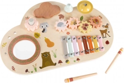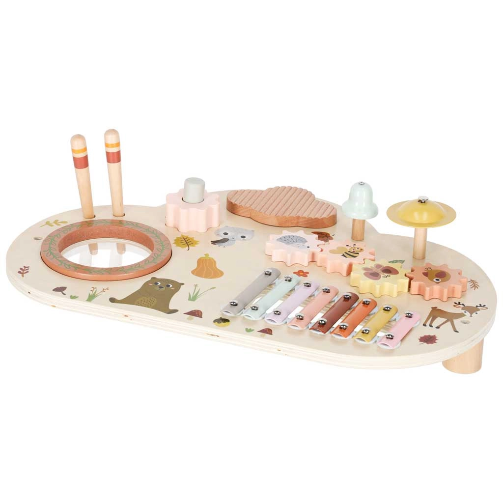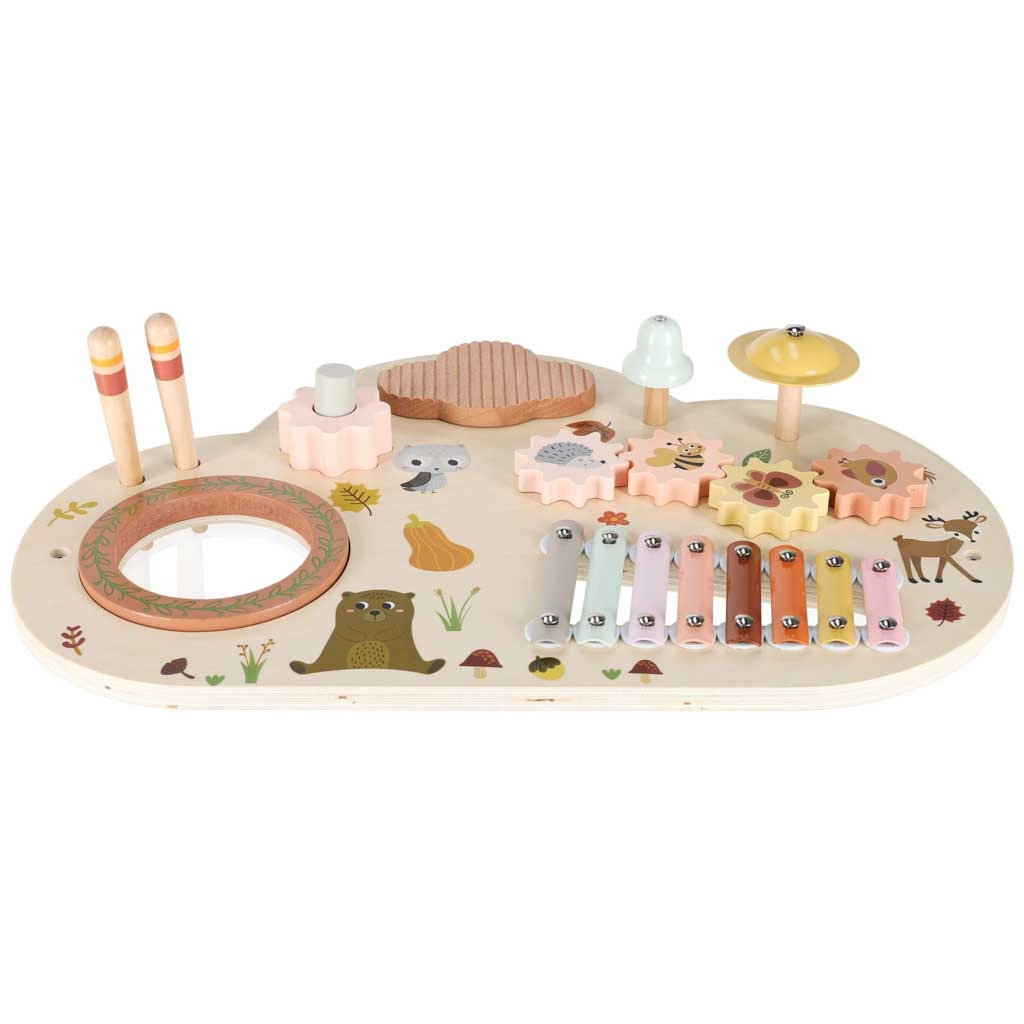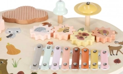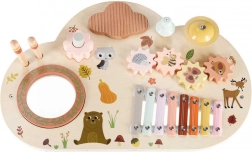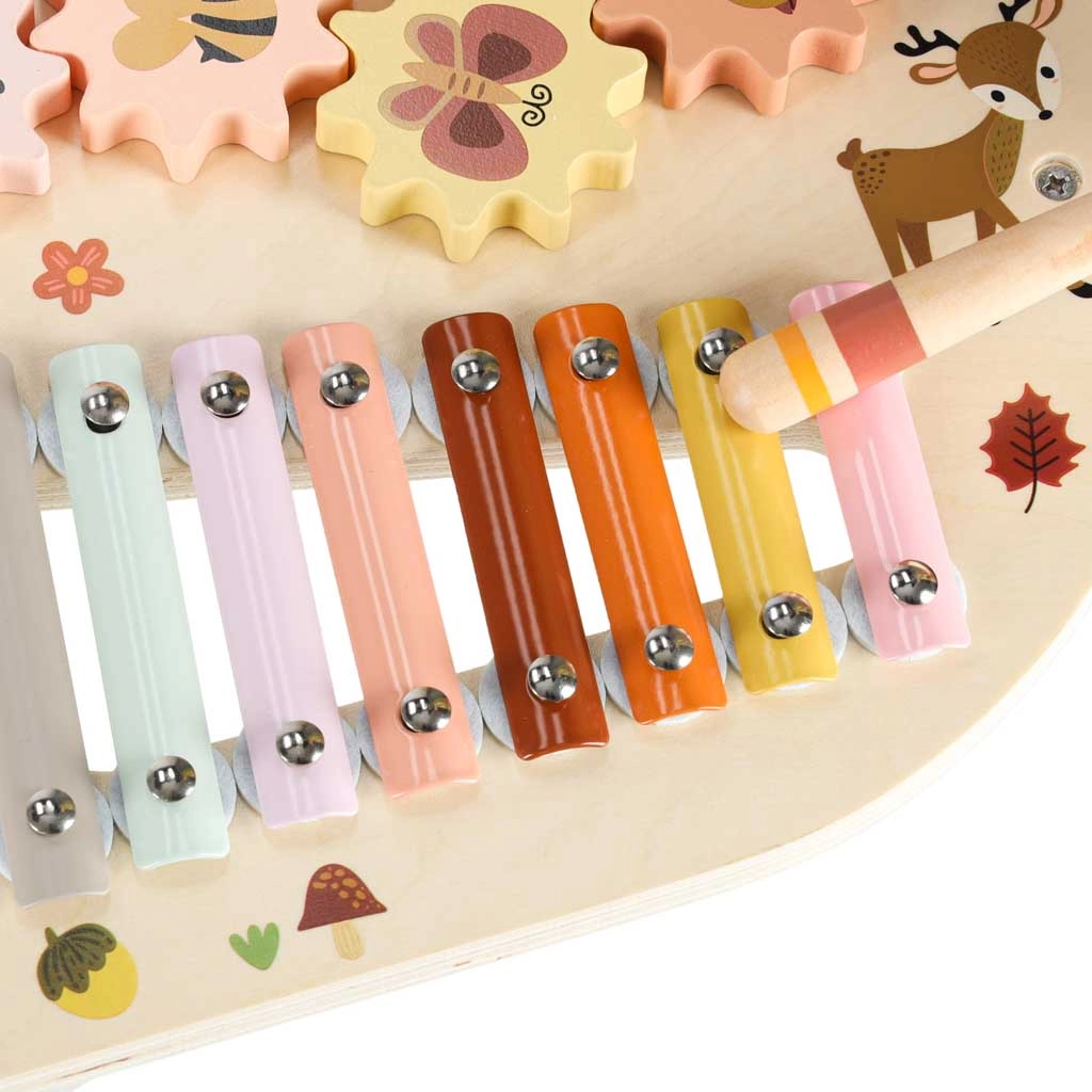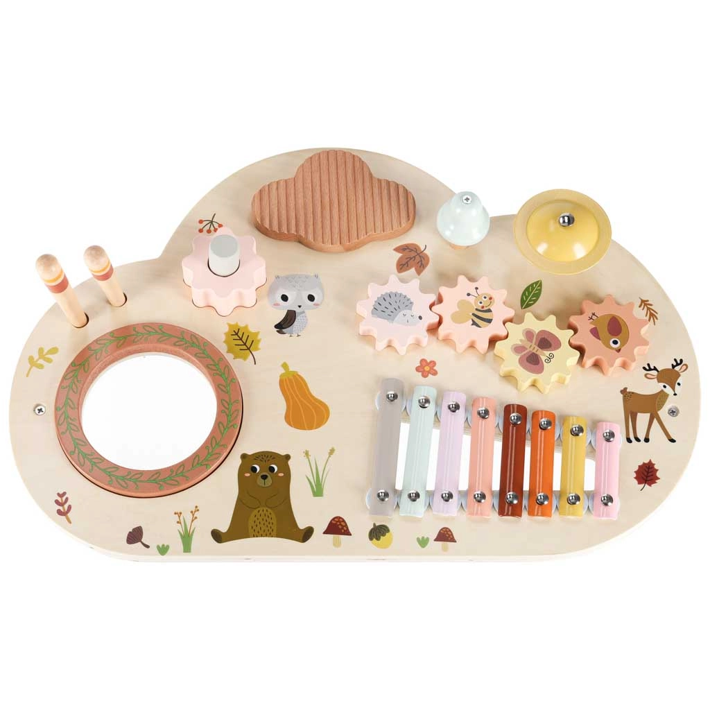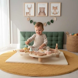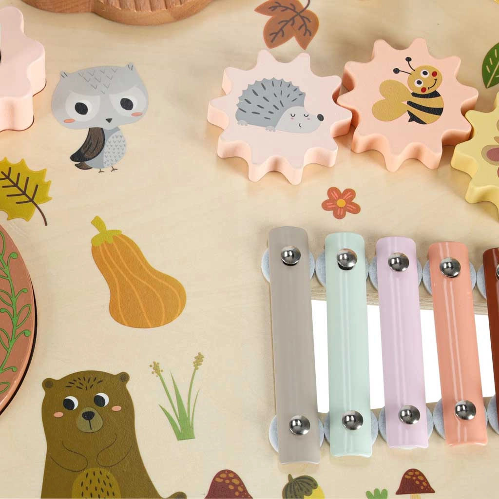 Ta lesena glasbena mizica je pravo središče aktivnosti – otroci lahko tolčejo s paličicami, vrtijo zobniška kolesca, raziskujejo teksture in ustvarjajo prve melodije. Vsak element podpira razvoj sluha, koordinacijo oko–roka ter fino motoriko in prinaša veselje ob odkrivanju.