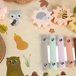 Kovinske tipke zvenijo čisto in spodbujajo otroke k eksperimentiranju z zvoki. Dve leseni paličici podpirata pravilen oprijem in koordinacijo.
