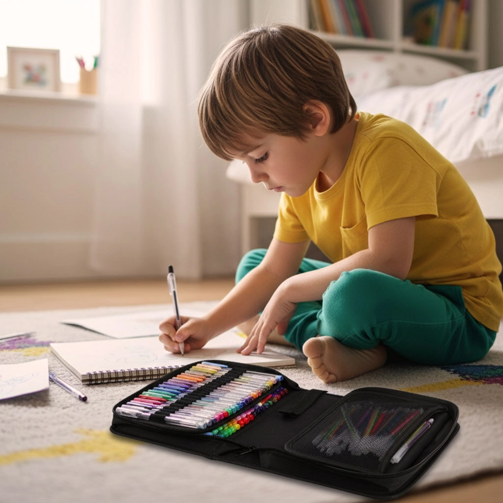 Zložljiv etui z elastičnimi držali ohranja pisala pregledno razporejena in zaščitena. Zlahka jih vzamete kamor koli s seboj.