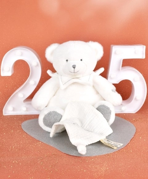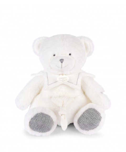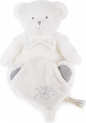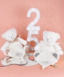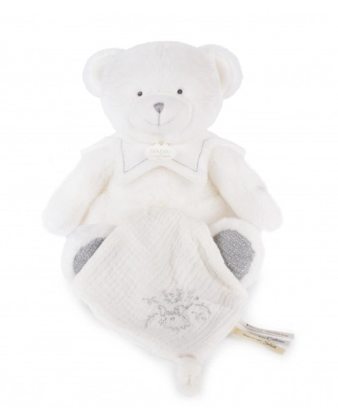 Ta mehki medvedek z ljubko varnostno odejico razveseli dojenčke in starše. Odejica je okrašena z nežno vezenino znamke DOUDOU in s satenastimi trakovi z ljubečimi sporočili, ki ustvarijo nežen večerni ritual pred spanjem. Zahvaljujoč možnosti shranjevanja odejice v medvedkov trebušček je komplet odličen tudi za na pot in se enostavno ohranja čist.