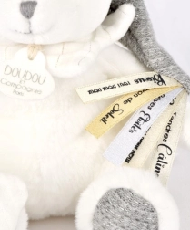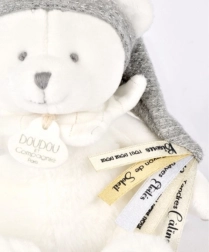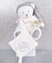 Ta eleganten darilni komplet združuje udobje in funkcionalnost v enem. Mehak medvedek s kapico in ovratničkom ima na tačko prišito mehko odejico, ki pomirja in pomaga pri lažjem uspavanju. Na koncu odejice je praktična priponka za dudo, ki poskrbi, da dudo vedno zlahka najdete in ostane čista.