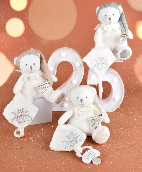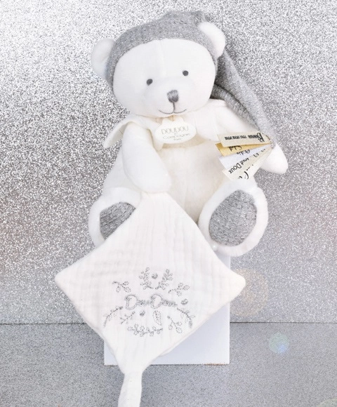 Ljubek plišasti medvedek bo postal prvi prijatelj vašega dojenčka. Povezuje cartasto odejico in praktično priponko za dudo, zato je vse pomembno vedno pri roki. Nežen premium material, pomirjujoči sivi toni in varna izdelava v skladu z evropskimi standardi CE ga naredijo za idealno darilo od rojstva dalje.