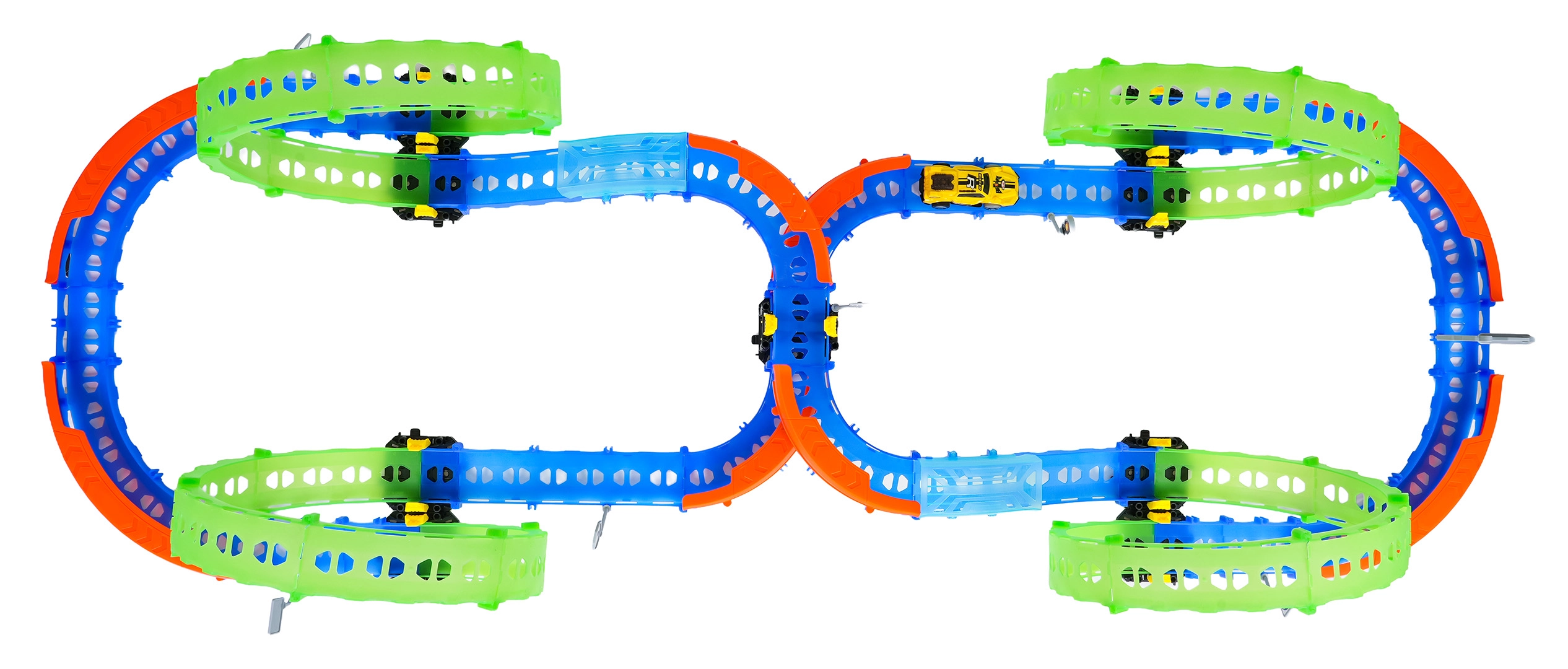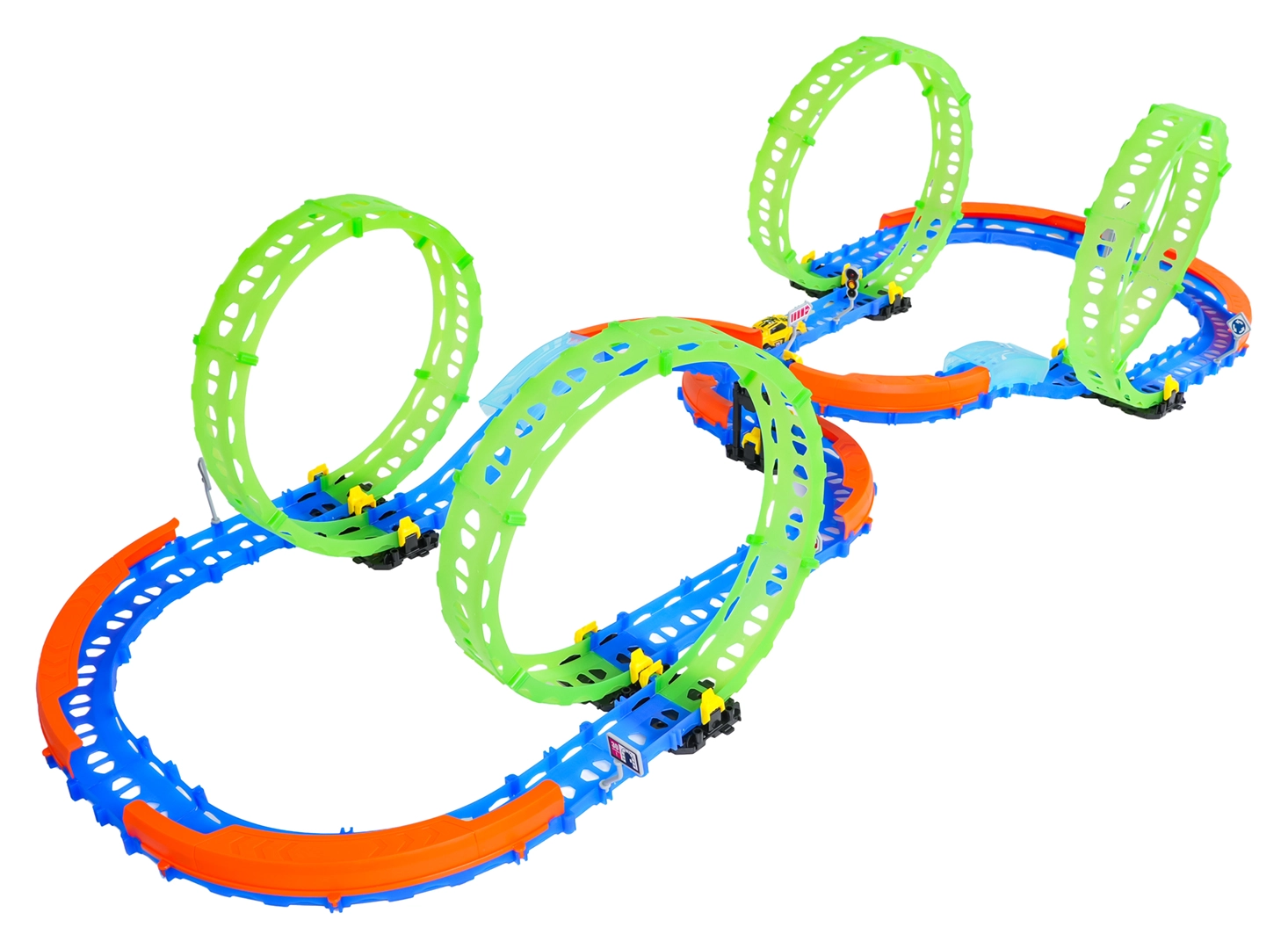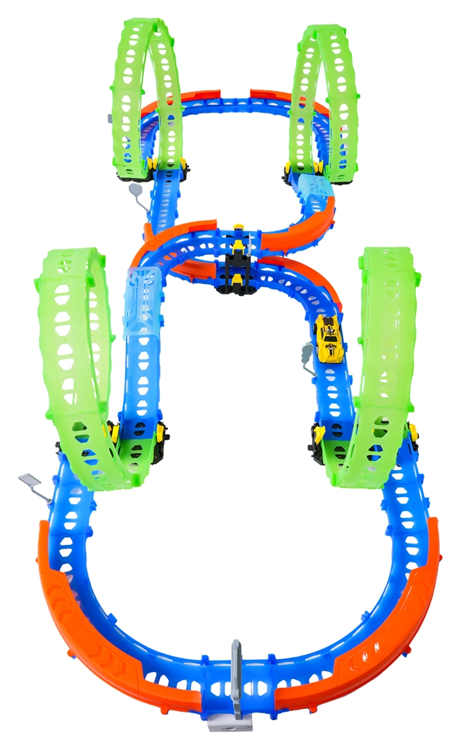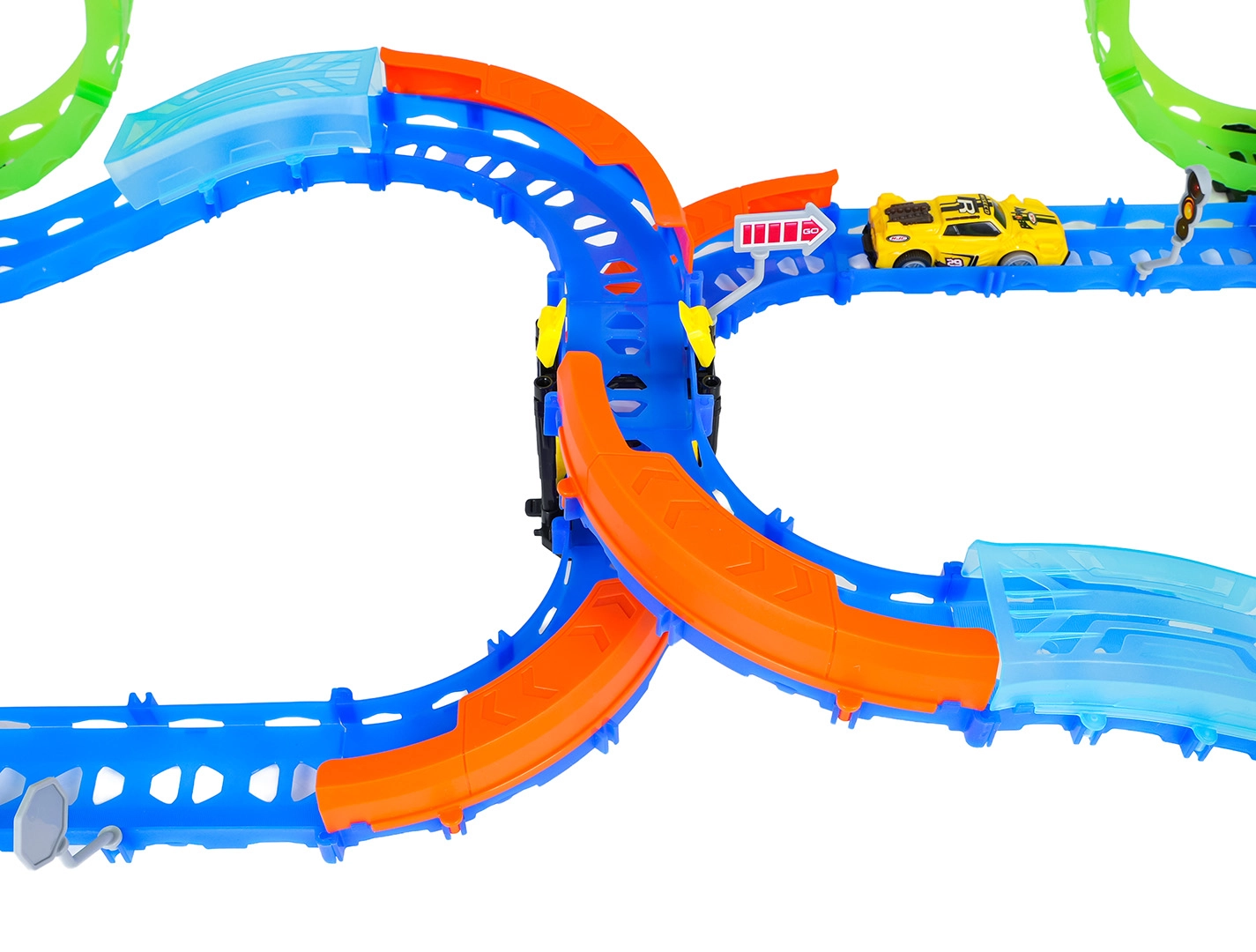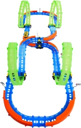 Ta barvita dirkalna steza ponuja vrhunske kaskaderske vožnje in kreativno sestavljanje. Zaradi fluorescentnih zank in svetlobnega učinka avtomobilčka posebej izstopa v temi, kjer se spremeni v žarečo progo polno napetja. Robustne ograje v ovinkih pomagajo avtomobilček varno držati na stezi.