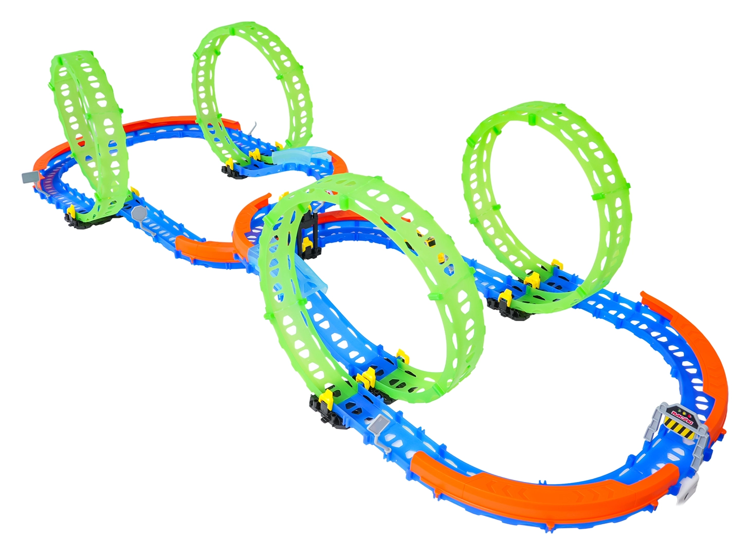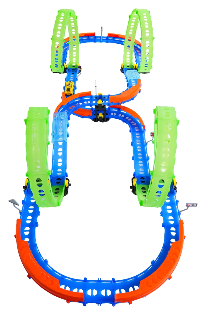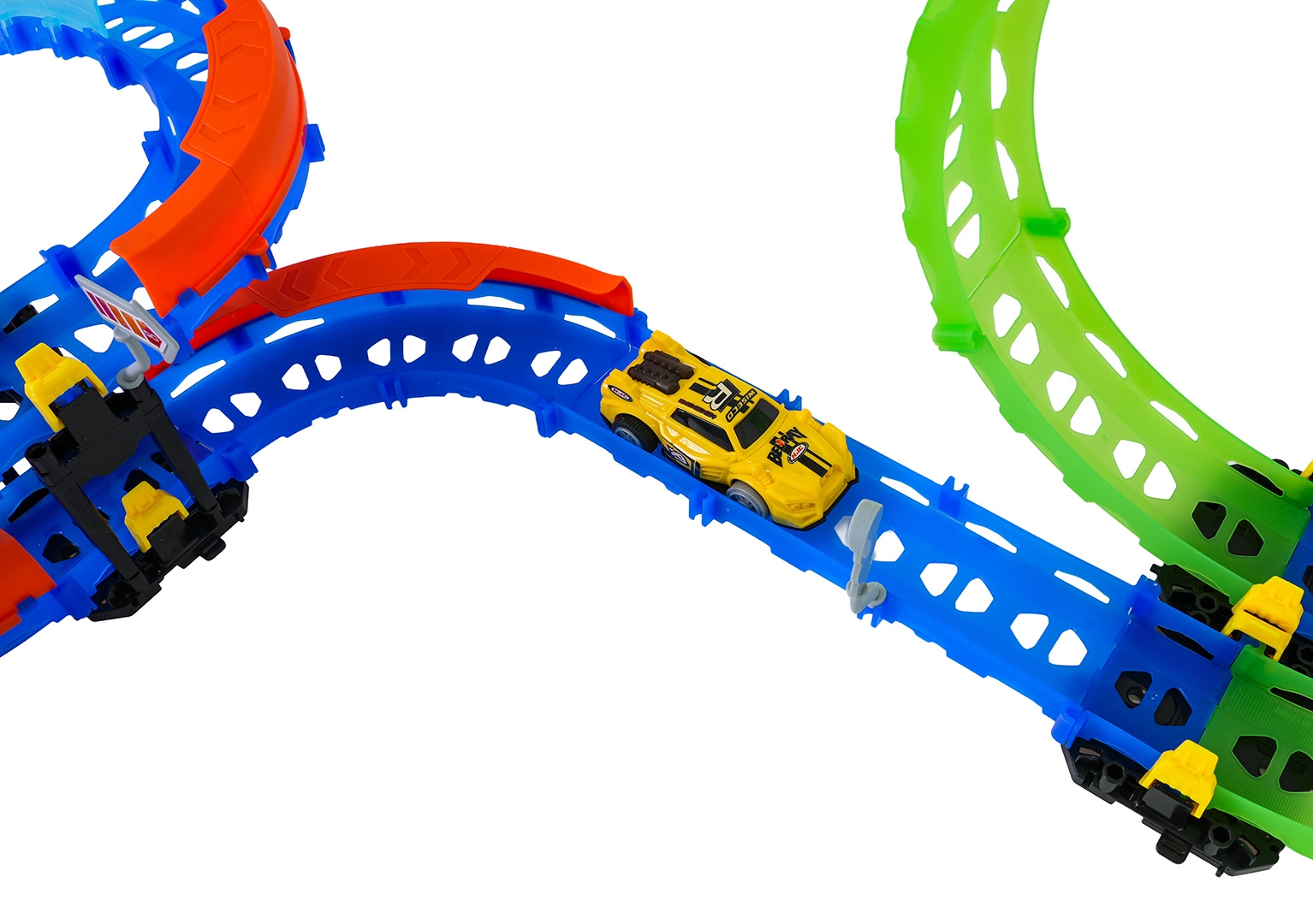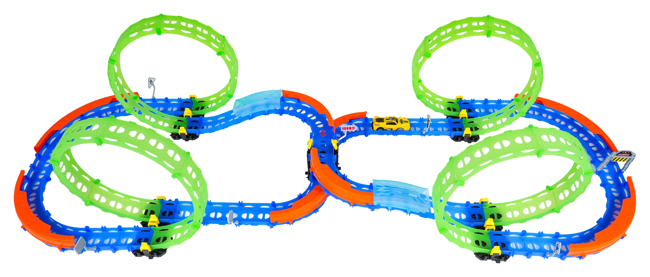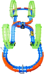 Ta barvita dirkalna steza ponuja vrhunske kaskaderske vožnje in kreativno sestavljanje. Zaradi fluorescentnih zank in svetlobnega učinka avtomobilčka posebej izstopa v temi, kjer se spremeni v žarečo progo polno napetja. Robustne ograje v ovinkih pomagajo avtomobilček varno držati na stezi.