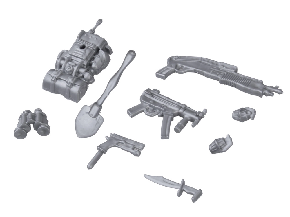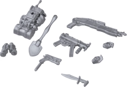 - Tank s plugom, helikopter, lovsko letalo, figurica vojaka, obrambna postojanka s strojnico, taktični nahrbtnik in dodatki (orožje, daljnogled, lopatka ipd.).