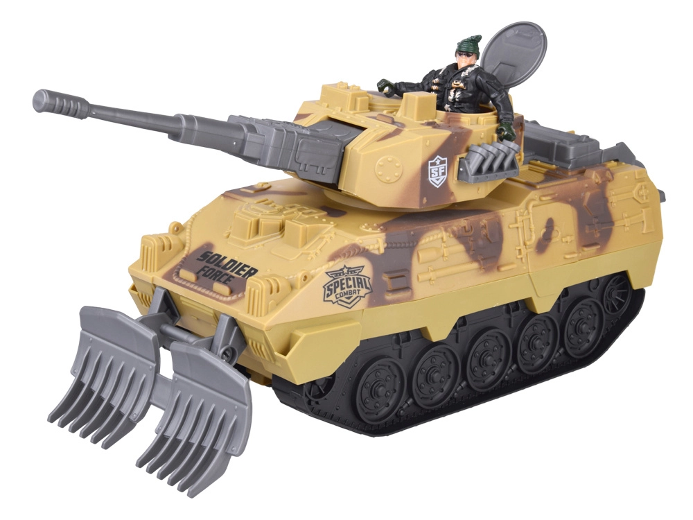 Podroben tank v puščavnem kamuflažnem vzorcu ima vrtljivo kupolo, dvigljivo topovsko cev, odpirajoč loput za figurico in sprednji plug za “čiščenje” ovir. Odličen za realistično manevriranje.