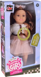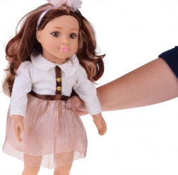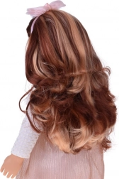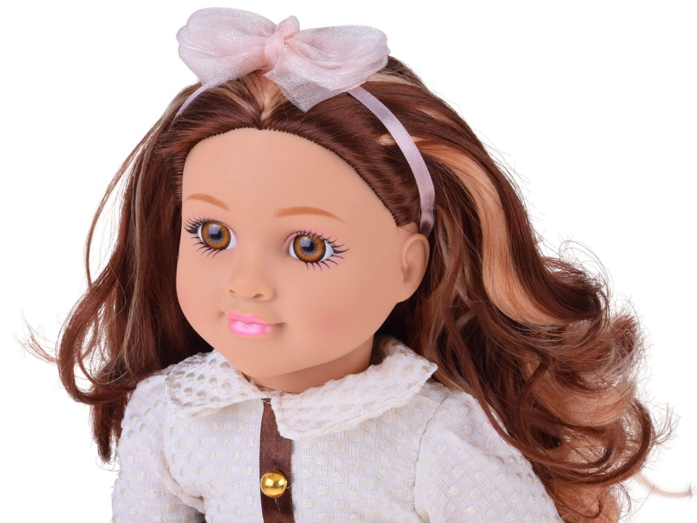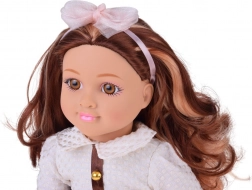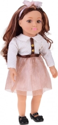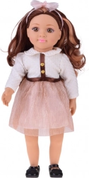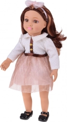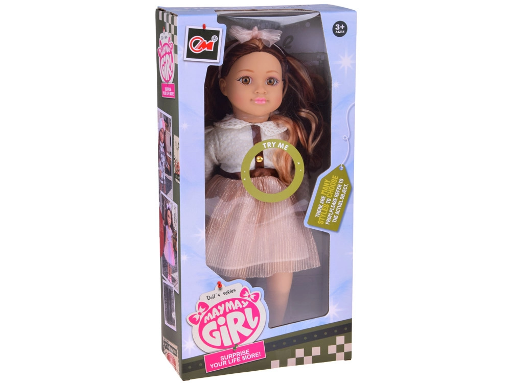 Očarljiva punčka MAY MAY GIRL izstopa s kombinacijo realističnih detajlov in kakovostne izdelave. Belo strukturirano majico z zlatimi gumbi, bleščeče rožnato krilo s pasom in obroč z mašno sestavljajo eleganten modni set, ki spodbuja domišljijo in stilsko preoblačenje.