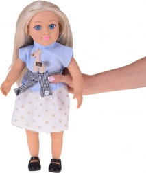Punčka je oblečena v elegantno kombinacijo – moder top s črtami in aplikacijo, šik pas ter kremno krilo z zlatimi motivi tvorijo ubran outfit, dopolnjen s črnimi balerinkami. Zaradi premičnih rok, nog in glave jo lahko preprosto posadite in uredite v različne poze za prizorčke in pripovedovanje zgodb.