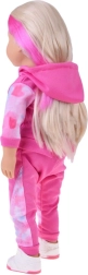 Členjene roke in noge punčki omogočajo stanje, sedenje in poziranje, zato je idealna za fotografiranje in vsakodnevno igro. Komplet vključuje kapucarico in jogger hlače s pastelnim tie-dye vzorcem, ki jih dopolnjujejo udobne superge. Oblačila so zlahka snemljiva, da lahko otroci uživajo v preoblačenju in razvijajo fino motoriko.
