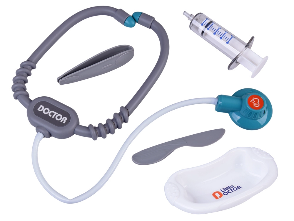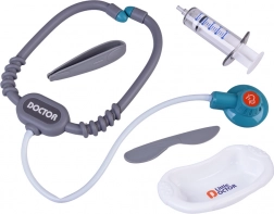 Stetoskop z zvoki srca, elektronski termometer, injekcija, škarje, pincete, otoskop, »zdravila« v stekleničkah in škatlicah – vse za popolno ordinacijo.