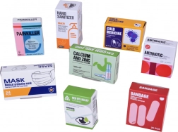 - Stetoskop z zvokom, elektronski termometer, injekcija, škarje, pincete, otoskop, kladivce, ogledalce, posodica, infuzija, pretisni omot »tabletk«, škatlice in stekleničke »zdravil«