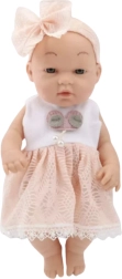 Ta punčka dojenček očara z elegantno rožnato oblekico s čipkastim robom in usklajenim naglavnim trakom z veliko pentljo. Nežni potezi obraza in prijetni materiali ustvarjajo vtis pravega dojenčka, ki ga bodo otroci hitro vzljubili.