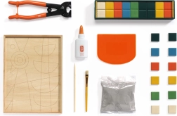 Organizirana škatla s predelki vsebuje pestro paleto mozaikovih ploščic, lepilo, čopič, mešalni prašek, strgalo in klešče. Dovolj je, da odprete in začnete ustvarjati.