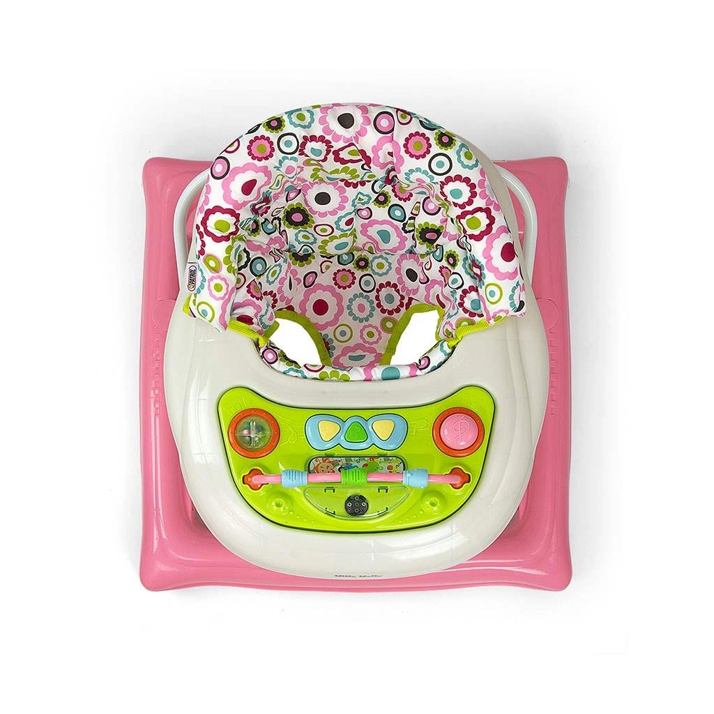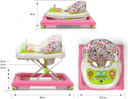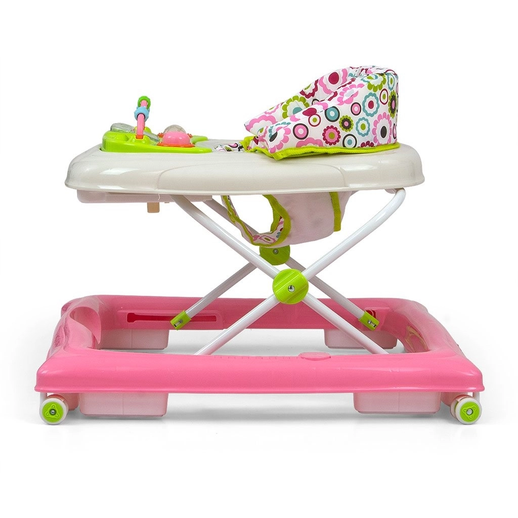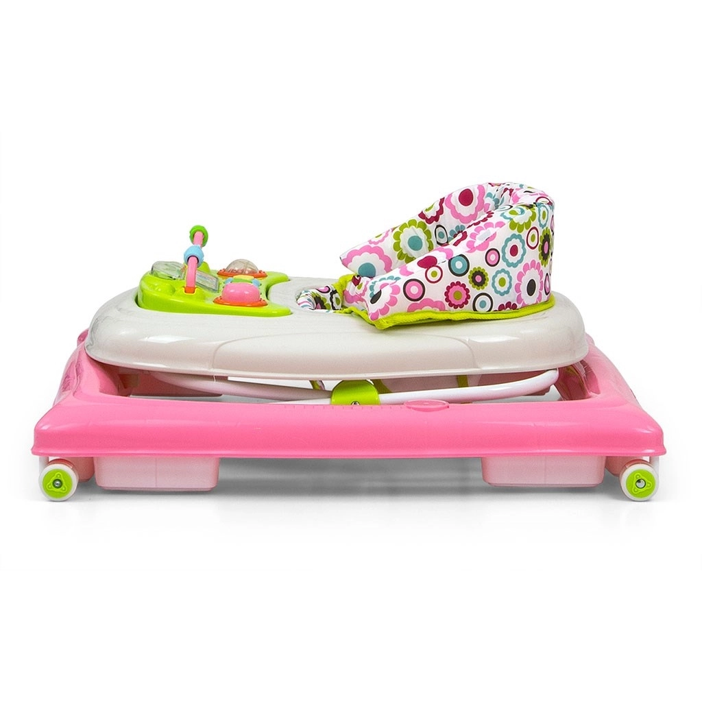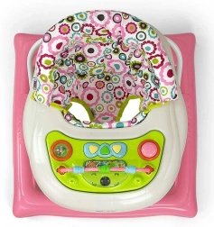 Interaktivna izobraževalna plošča z lučkami, melodijami, piskalnikom, ropotuljico in gumbi razvija čute in motoriko. Ploščo je mogoče preprosto odstraniti in uporabljati samostojno kot igračo na poti, pladenj pa služi kot igralna ali prigrizkovna mizica. Štiri kakovostna vrtljiva kolesca zagotavljajo gladko gibanje, osem gumijastih zavor pa varuje pred zdrsom po stopnicah.