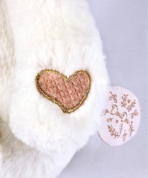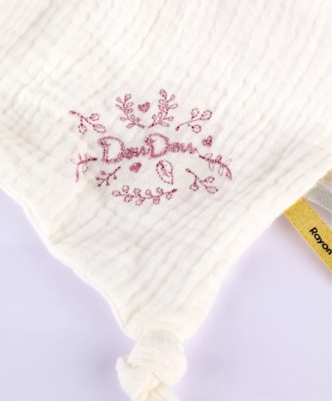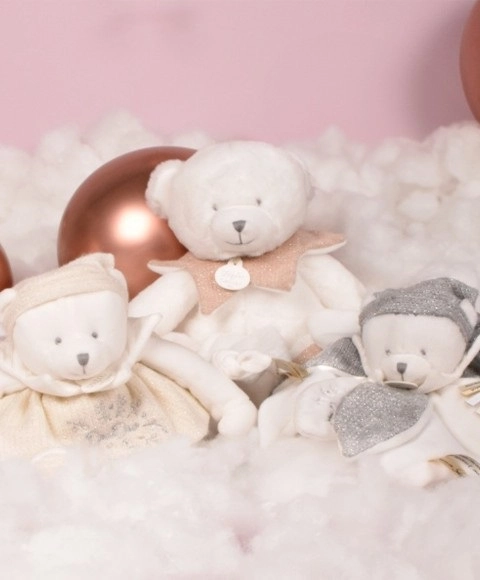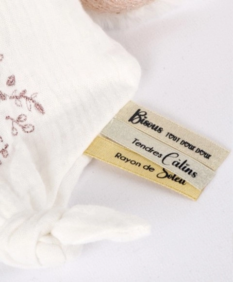 Dizajn krasi nežen vezen logotip znamke Doudou ter satenske trakove z ljubkimi francoskimi sporočilci, ki celotnemu setu dodajo eleganten in nežen značaj. Medvedek ima rožnato srček na tački, ovratniček pod vratom in mehke tačke – odlično darilo za novorojenčke.