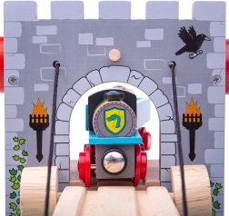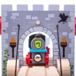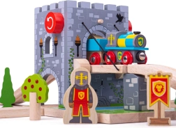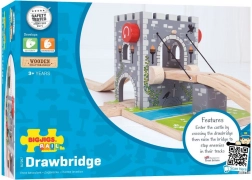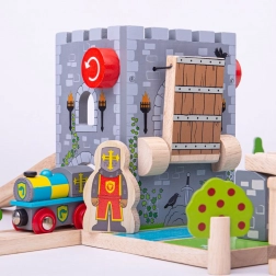 Ustvarite na progi srednjeveško utrdbo! Leseni dvižni most BIGJIGS RAIL z delujočo vitlo omogoča otrokom dvigniti most, ustaviti vlakec in uprizoriti viteške pustolovščine. Realistično kamnito zidovje, grbi, bakle in most čez “vodni” jarek spodbujajo domišljijo in tematsko igro.