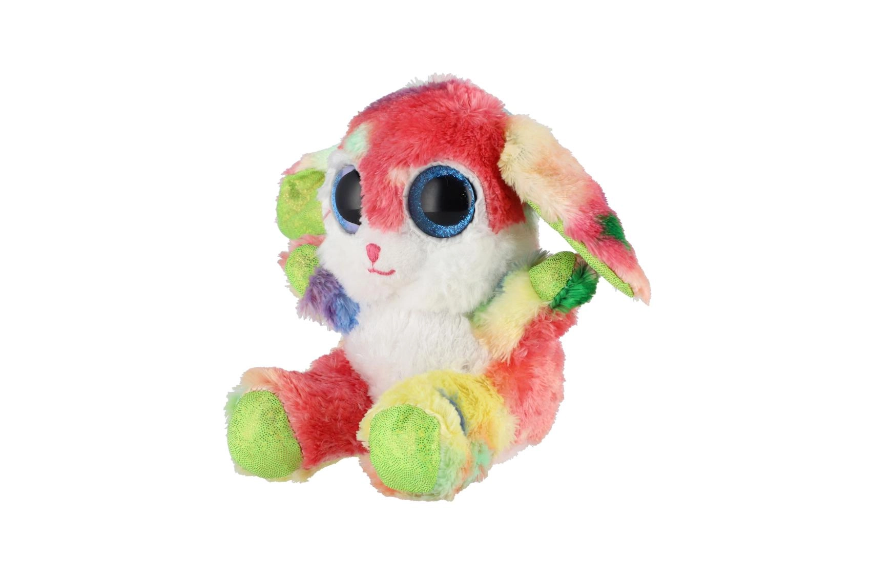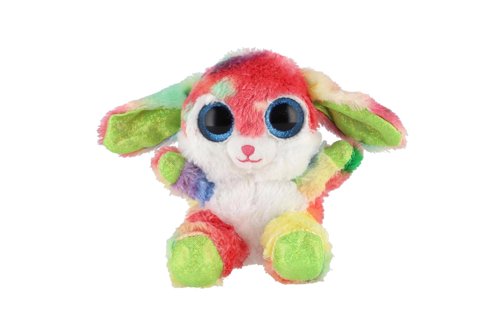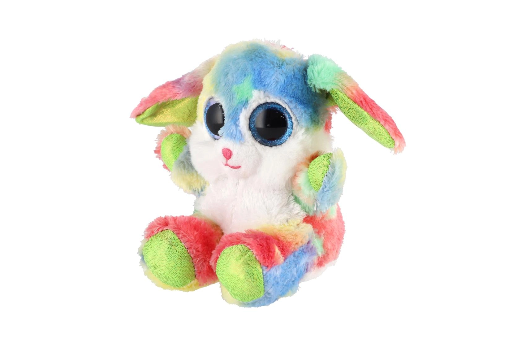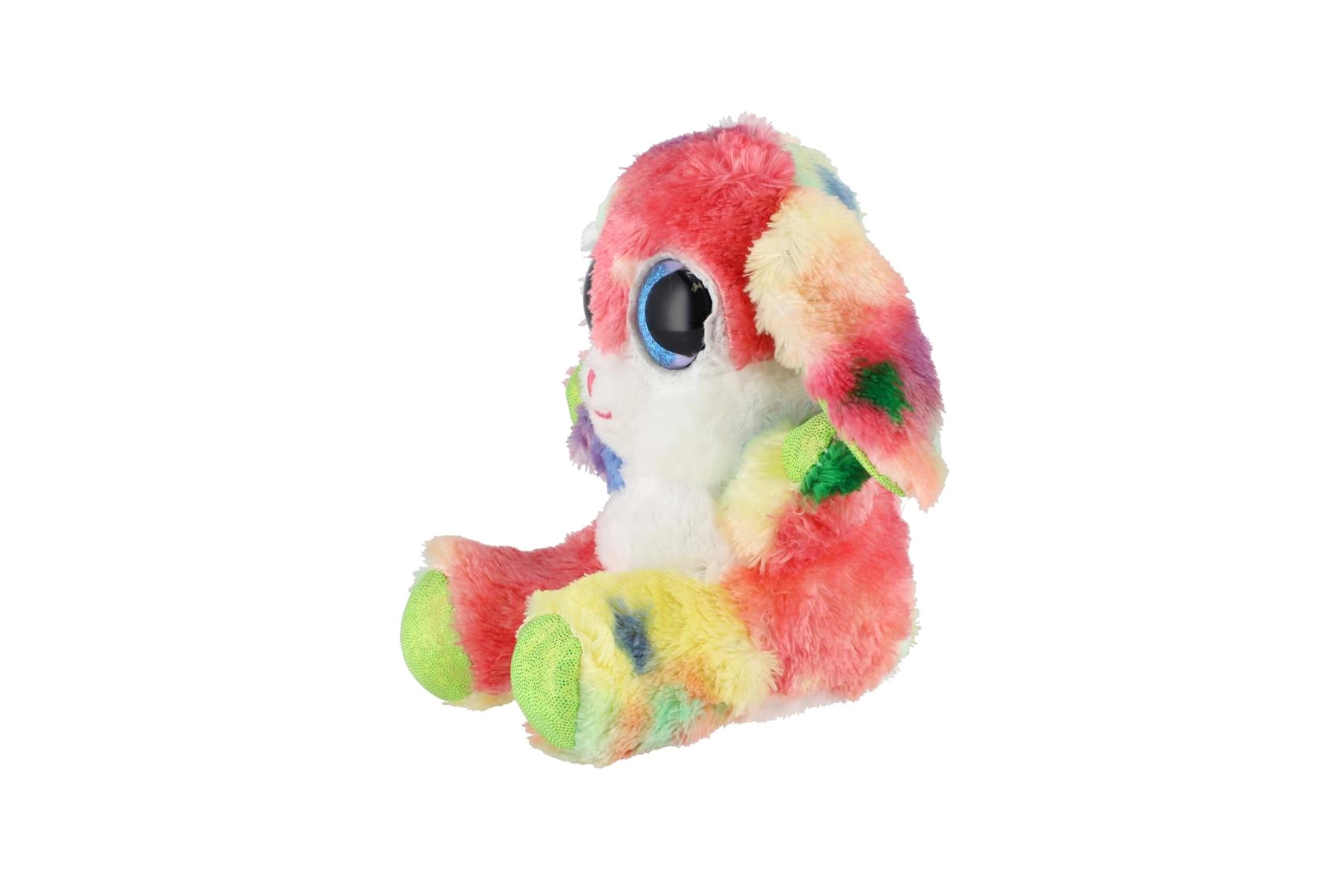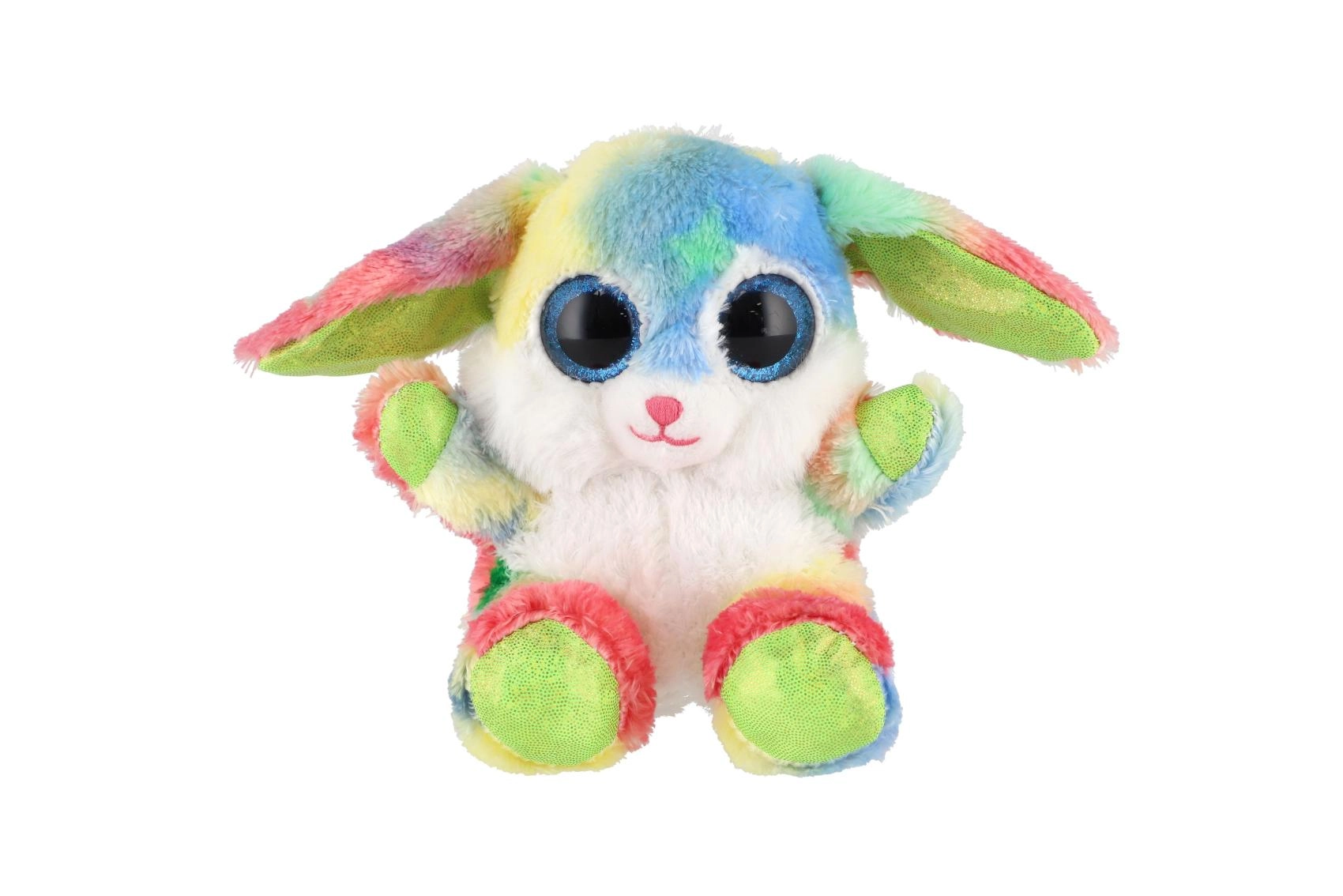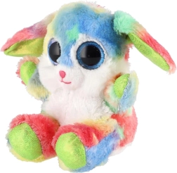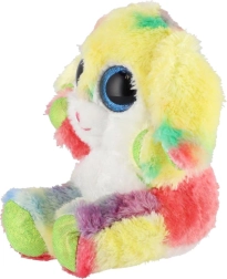 Prisrčen sedeči zajček v mavričnih barvah z velikimi bleščečimi očmi je idealen muci za otroke. Izdelan je iz zelo mehkega pliša, ima dolg, upogljiv ušesek in kompaktno velikost 15 cm za enostavno nošenje v posteljico, nahrbtnik ali na potovanja.