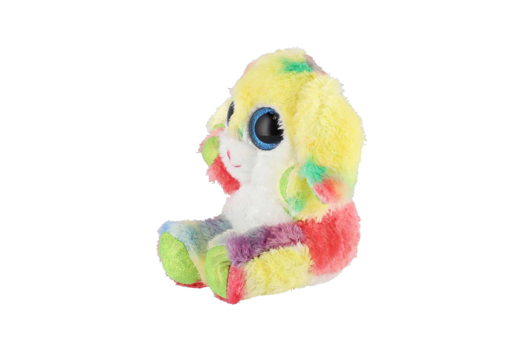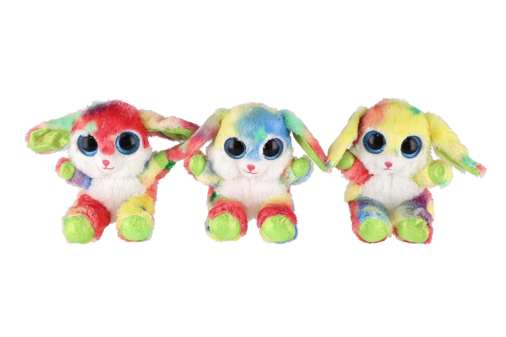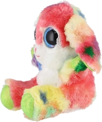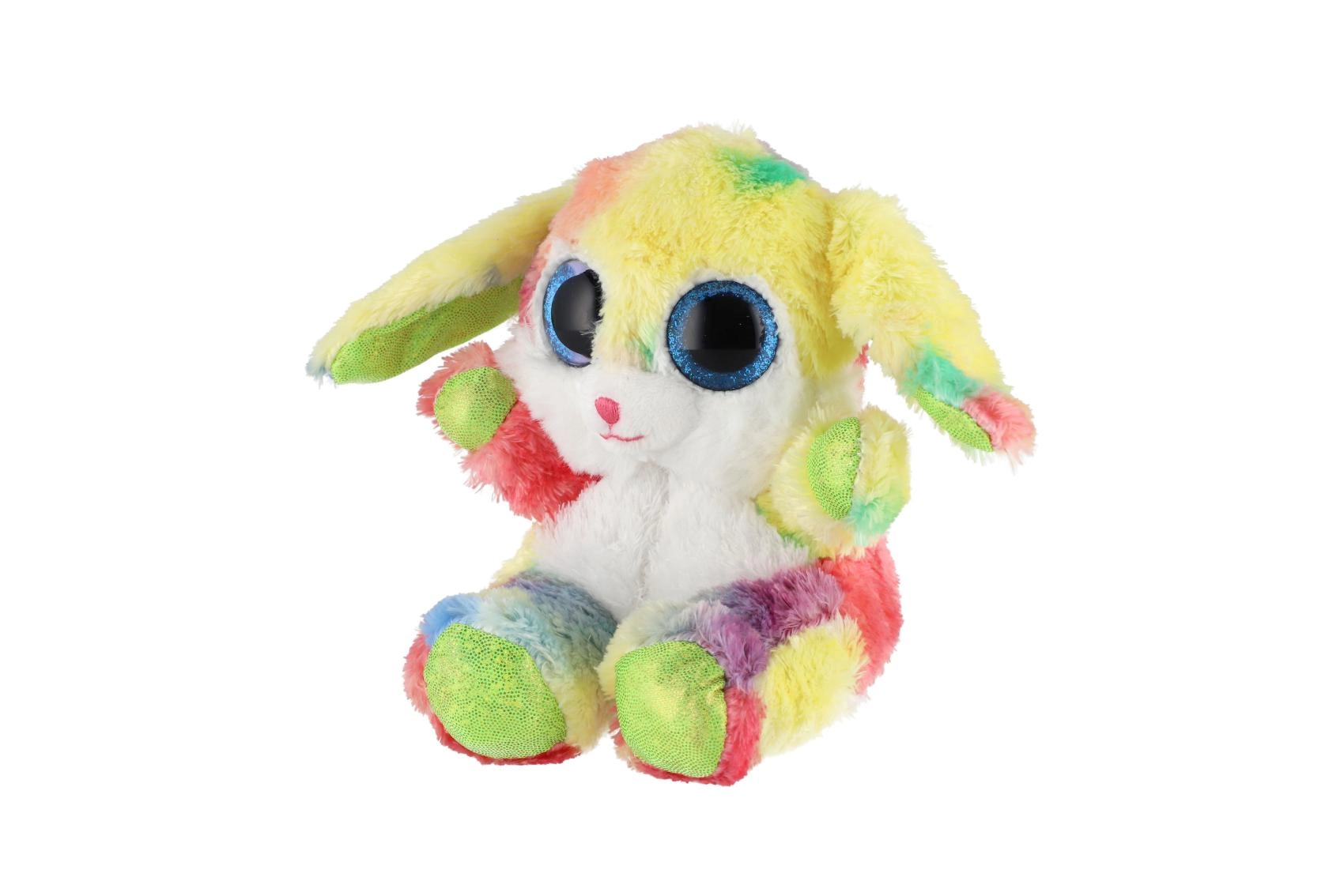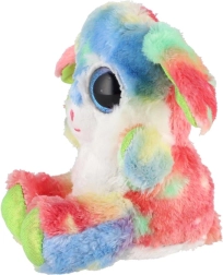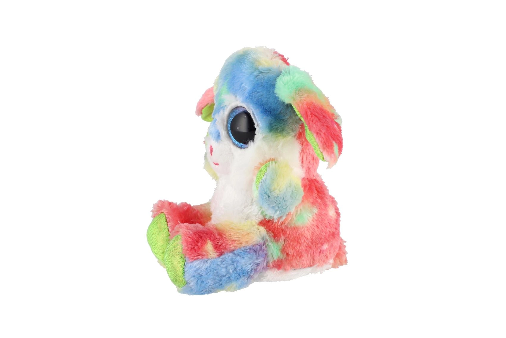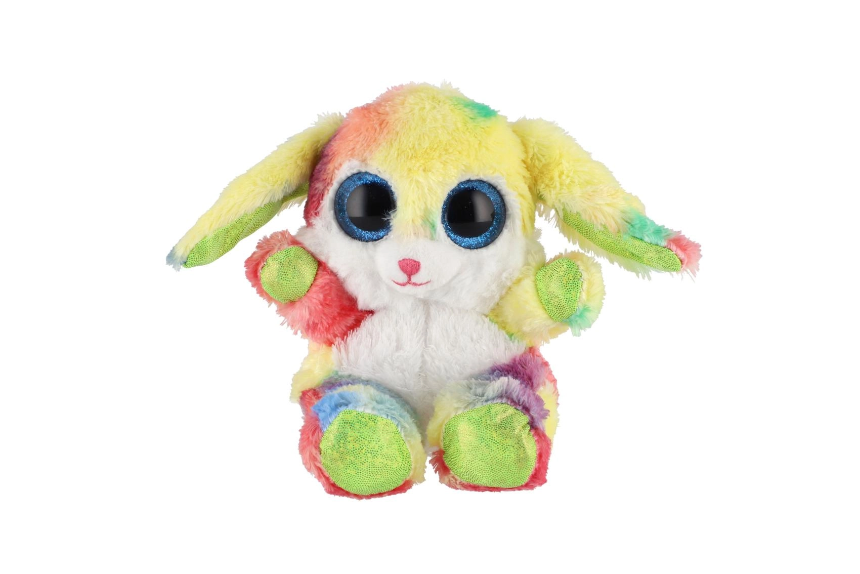 Prisrčen sedeči zajček v mavričnih barvah z velikimi bleščečimi očmi je idealen muci za otroke. Izdelan je iz zelo mehkega pliša, ima dolg, upogljiv ušesek in kompaktno velikost 15 cm za enostavno nošenje v posteljico, nahrbtnik ali na potovanja.